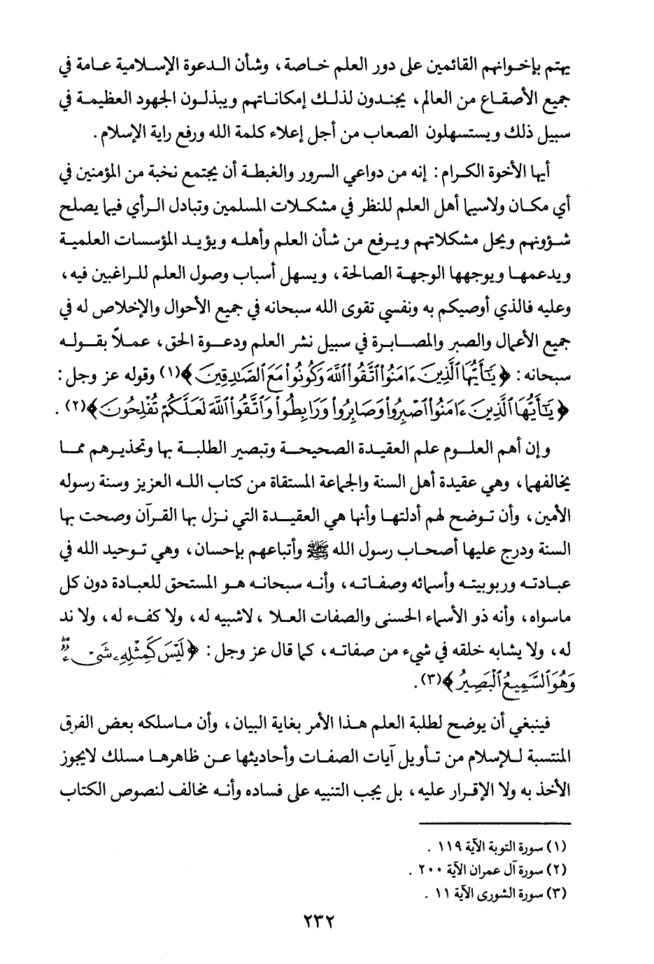 أيها الإخوة الكرام: إنه من دواعي السرور والغبطة أن يجتمع نخبة من المؤمنين في أي مكان ولا سيما أهل العلم للنظر في مشكلات المسلمين وتبادل الرأي فيما يصلح شئونهم ويحل مشكلاتهم ويرفع من شأن العلم وأهله ويؤيد المؤسسات العلمية ويدعمها ويوجهها الوجهة الصالحة، ويسهل أسباب وصول العلم للراغبين فيه، وعليه فالذي أوصيكم به ونفسي تقوى الله سبحانه في جميع الأحوال والإخلاص له في جميع الأعمال والصبر والمصابرة في سبيل نشر العلم ودعوة الحق، عملا بقوله سبحانه: {يَا أَيُّهَا الَّذِينَ آمَنُوا اتَّقُوا اللَّهَ وَكُونُوا مَعَ الصَّادِقِينَ} (¬1) وقوله عز وجل: {يَا أَيُّهَا الَّذِينَ آمَنُوا اصْبِرُوا وَصَابِرُوا وَرَابِطُوا وَاتَّقُوا اللَّهَ لَعَلَّكُمْ تُفْلِحُونَ} (¬2) وإن أهم العلوم علم العقيدة الصحيحة وتبصير الطلبة بها وتحذيرهم مما يخالفهما، وهي عقيدة أهل السنة والجماعة المستقاة من كتاب الله العزيز وسنة رسوله الأمين، وأن توضح لهم أدلتها وأنها هي العقيدة التي نزل بها القرآن وصحت بها السنة ودرج عليها أصحاب رسول الله وأتباعهم بإحسان، وهي توحيد الله في عبادته وربوبيته وأسمائه وصفاته، وأنه سبحانه هو المستحق للعبادة دون كل ما سواه، وأنه ذو الأسماء الحسنى والصفات العلى، لا شبيه له، ولا كفء له، ولا ند له، ولا يشابه خلقه في شيء من صفاته، كما قال عز وجل: {لَيْسَ كَمِثْلِهِ شَيْءٌ وَهُوَ السَّمِيعُ الْبَصِيرُ} (¬3) فينبغي أن يوضح لطلبة العلم هذا الأمر بغاية البيان، وأن ما سلكه بعض الفرق المنتسبة للإسلام من تأويل آيات الصفات وأحاديثها عن ظاهرها مسلك لا يجوز الأخذ به ولا الإقرار عليه، بل يجب التنبيه على فساده وأنه مخالف لنصوص الكتاب