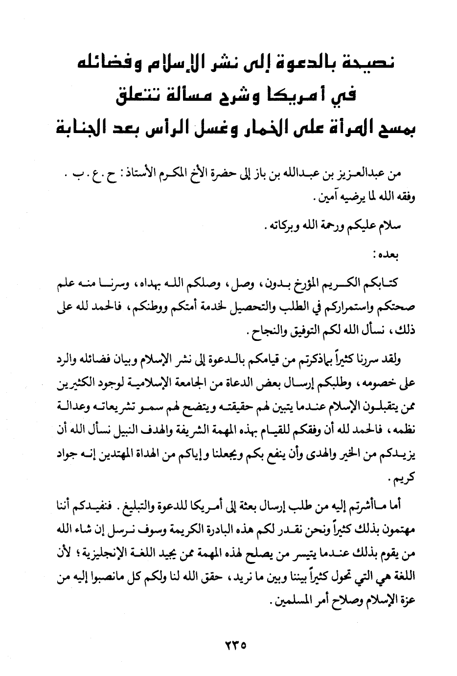 أما ما أشرتم إليه من طلب إرسال بعثة إلى أمريكا للدعوة والتبليغ، فنفيدكم أننا مهتمون بذلك كثيرا ونحن نقدر لكم هذه البادرة الكريمة، وسوف نرسل إن شاء الله من يقوم بذلك عندما يتيسر من يصلح لهذه المهمة ممن يجيد اللغة الإنجليزية؛ لأن اللغة هي التي تحول كثيرا بيننا وبين ما نريد، حقق الله لنا ولكم كل ما نصبو إليه من عزة الإسلام وصلاح أمر المسلمين.