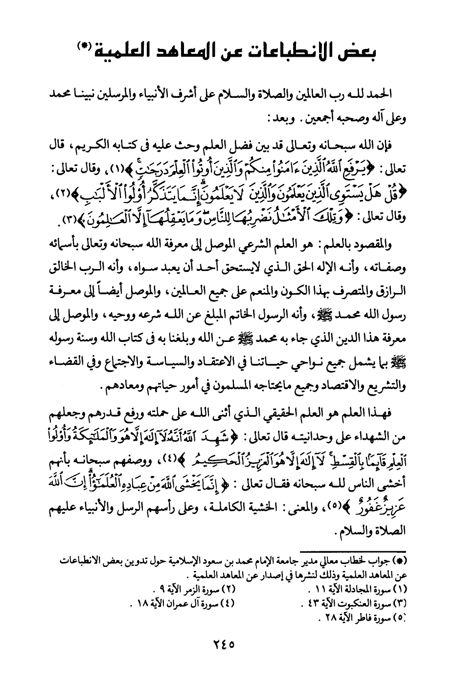 وبعد: فإن الله سبحانه وتعالى قد بين فضل العلم وحث عليه في كتابه الكريم، قال تعالى: {يَرْفَعِ اللَّهُ الَّذِينَ آمَنُوا مِنْكُمْ وَالَّذِينَ أُوتُوا الْعِلْمَ دَرَجَاتٍ} (¬1) وقال تعالى: {هَلْ يَسْتَوِي الَّذِينَ يَعْلَمُونَ وَالَّذِينَ لَا يَعْلَمُونَ إِنَّمَا يَتَذَكَّرُ أُولُو الْأَلْبَابِ} (¬2) وقال تعالى: {وَتِلْكَ الْأَمْثَالُ نَضْرِبُهَا لِلنَّاسِ وَمَا يَعْقِلُهَا إِلَّا الْعَالِمُونَ} (¬3)