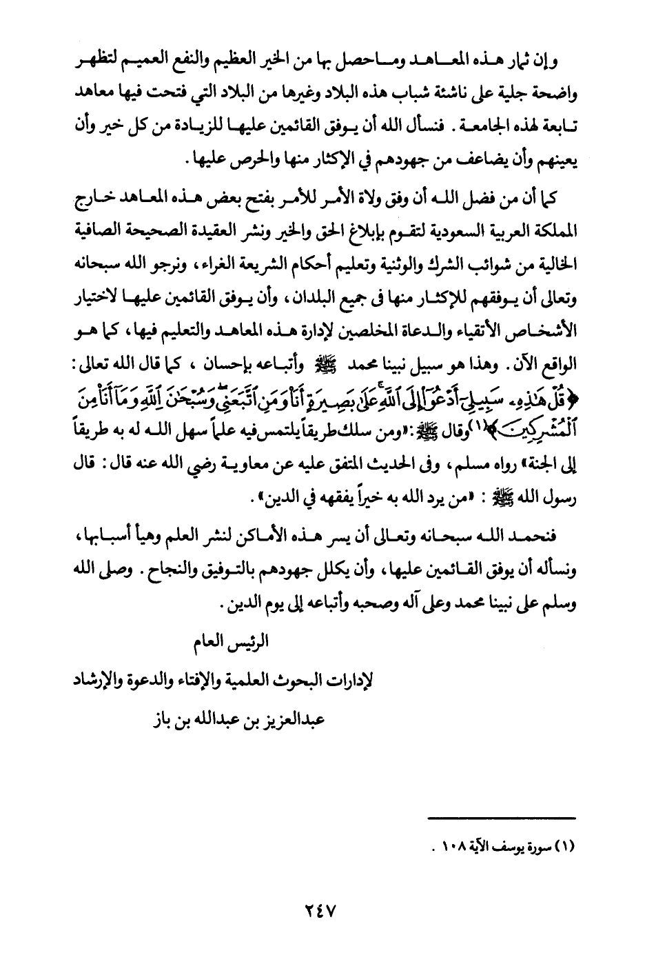 كما أن من فضل الله أن وفق ولاة الأمر للأمر بفتح بعض هذه المعاهد خارج المملكة العربية للسعودية لتقوم بإبلاغ الحق والخير ونشر العقيدة الصحيحة الصافية الخالية من شوائب الشرك والوثنية وتعليم أحكام الشريعة الغراء، ونرجو الله سبحانه وتعالى أن يوفقهم للإكثار منها في جميع البلدان، وأن يوفق القائمين عليها لاختيار الأشخاص الأتقياء والدعاة المخلصين لإدارة هذه المعاهد والتعليم فيها، كما هو الواقع الآن. وهذا هو سبيل نبينا محمد صلى الله عليه وسلم، وأتباعه بإحسان، كما قال الله تعالى: {قُلْ هَذِهِ سَبِيلِي أَدْعُو إِلَى اللَّهِ عَلَى بَصِيرَةٍ أَنَا وَمَنِ اتَّبَعَنِي وَسُبْحَانَ اللَّهِ وَمَا أَنَا مِنَ الْمُشْرِكِينَ} (¬1) وقال: «ومن سلك طريقا يلتمس فيه علما سهل الله له به طريقا إلى الجنة (¬2) » رواه مسلم، وفي الحديث المتفق عليه عن معاوية رضي الله عنه قال: قال رسول الله صلى الله عليه وسلم: «من يرد الله به خيرا يفقهه في الدين (¬3) » .
