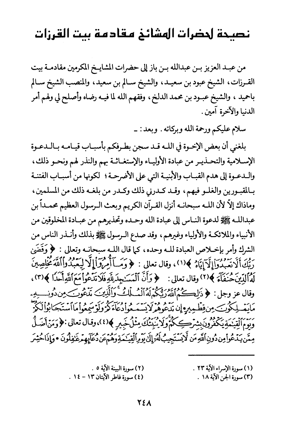 بلغني أن بعض الإخوة في الله قد سجن بطرفكم بأسباب قيامه بالدعوة الإسلامية والتحذير من عبادة الأولياء والاستغاثة بهم والنذر لهم ونحو ذلك، والدعوة إلى هدم القباب والأبنية التي على الأضرحة لكونها من أسباب الفتنة بالمقبورين والغلو فيهم، وقد كدرني ذلك وكدر من بلغه ذلك من المسلمين، وما ذاك إلا لأن الله سبحانه أنزل القرآن الكريم وبعث الرسول العظيم محمد بن عبد الله لدعوة الناس إلى عبادة الله وحده وتحذيرهم من عبادة المخلوقين من الأنبياء والملائكة والأولياء وغيرهم، وقد صدع الرسول بذلك وأنذر الناس من الشرك وأمر بإخلاص العبادة لله وحده، كما قال الله سبحانه وتعالى: {وَقَضَى رَبُّكَ أَلَّا تَعْبُدُوا إِلَّا إِيَّاهُ} (¬1) وقال تعالى: {وَمَا أُمِرُوا إِلَّا لِيَعْبُدُوا اللَّهَ مُخْلِصِينَ لَهُ الدِّينَ حُنَفَاءَ} (¬2) وقال تعالى: {وَأَنَّ الْمَسَاجِدَ لِلَّهِ فَلَا تَدْعُوا مَعَ اللَّهِ أَحَدًا} (¬3) وقال عز وجل: {ذَلِكُمُ اللَّهُ رَبُّكُمْ لَهُ الْمُلْكُ وَالَّذِينَ تَدْعُونَ مِنْ دُونِهِ مَا يَمْلِكُونَ مِنْ قِطْمِيرٍ} (¬4) {إِنْ تَدْعُوهُمْ لَا يَسْمَعُوا دُعَاءَكُمْ وَلَوْ سَمِعُوا مَا اسْتَجَابُوا لَكُمْ وَيَوْمَ الْقِيَامَةِ يَكْفُرُونَ بِشِرْكِكُمْ وَلَا يُنَبِّئُكَ مِثْلُ خَبِيرٍ} (¬5) وقال تعالى