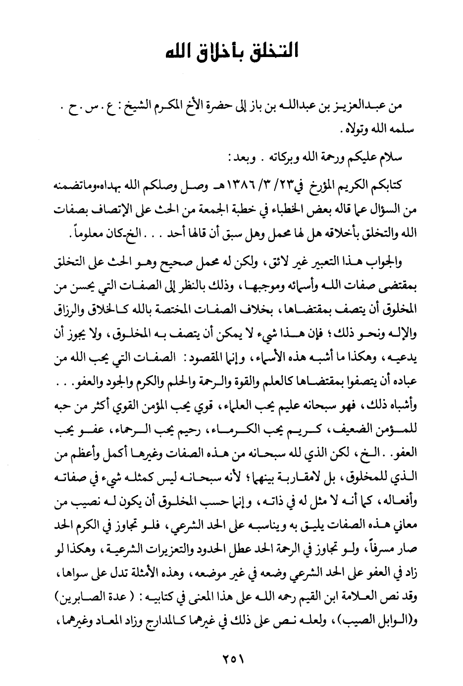 كتابكم الكريم المؤرخ في 23 \ 3 \ 1386 هـ وصل، وصلكم الله بهداه، وما تضمنه من السؤال عما قاله بعض الخطباء في خطبة الجمعة من الحث على الاتصاف بصفات الله والتخلق بأخلاقه هل لها محمل وهل سبق أن قالها أحد ... إلخ - كان معلوما.