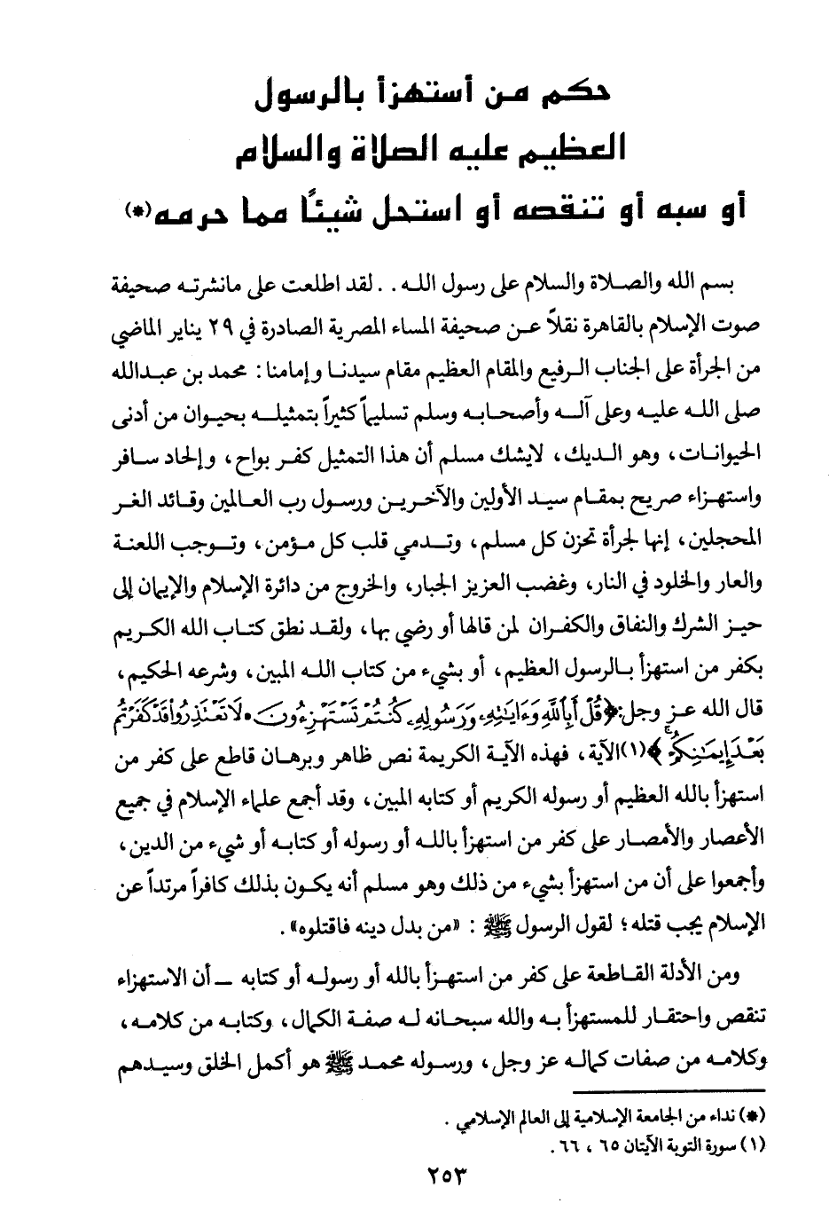 لقد اطلعت على ما نشرته صحيفة صوت الإسلام بالقاهرة نقلا عن صحيفة المساء المصرية الصادرة في 29 يناير الماضي من الجرأة على الجناب الرفيع والمقام العظيم مقام سيدنا وإمامنا: محمد بن عبد الله صلى الله عليه وعلى آله وأصحابه وسلم تسليما كثيرا بتمثيله بحيوان من أدنى الحيوانات، وهو الديك، لا يشك مسلم أن هذا التمثيل كفر بواح، وإلحاد سافر واستهزاء صريح بمقام سيد الأولين والآخرين ورسول رب العالمين وقائد الغر المحجلين، إنها لجرأة تحزن كل مسلم، وتدمي قلب كل مؤمن، وتوجب اللعنة والعار والخلود في النار، وغضب العزيز الجبار، والخروح من دائرة الإسلام والإيمان إلى حيز الشرك والنفاق والكفران لمن قالها أو رضي بها، ولقد نطق كتاب الله الكريم بكفر من استهزأ بالرسول العظيم، أو بشيء من كتاب الله المبين، وشرعه الحكيم، قال الله عز وجل: {أَبِاللَّهِ وَآيَاتِهِ وَرَسُولِهِ كُنْتُمْ تَسْتَهْزِئُونَ} (¬1) {لَا تَعْتَذِرُوا قَدْ كَفَرْتُمْ بَعْدَ إِيمَانِكُمْ} (¬2) الآية، فهذه الآية الكريمة نص ظاهر وبرهان قاطع على كفر من استهزأ بالله العظيم أو رسوله الكريم أو كتابه المبين.
