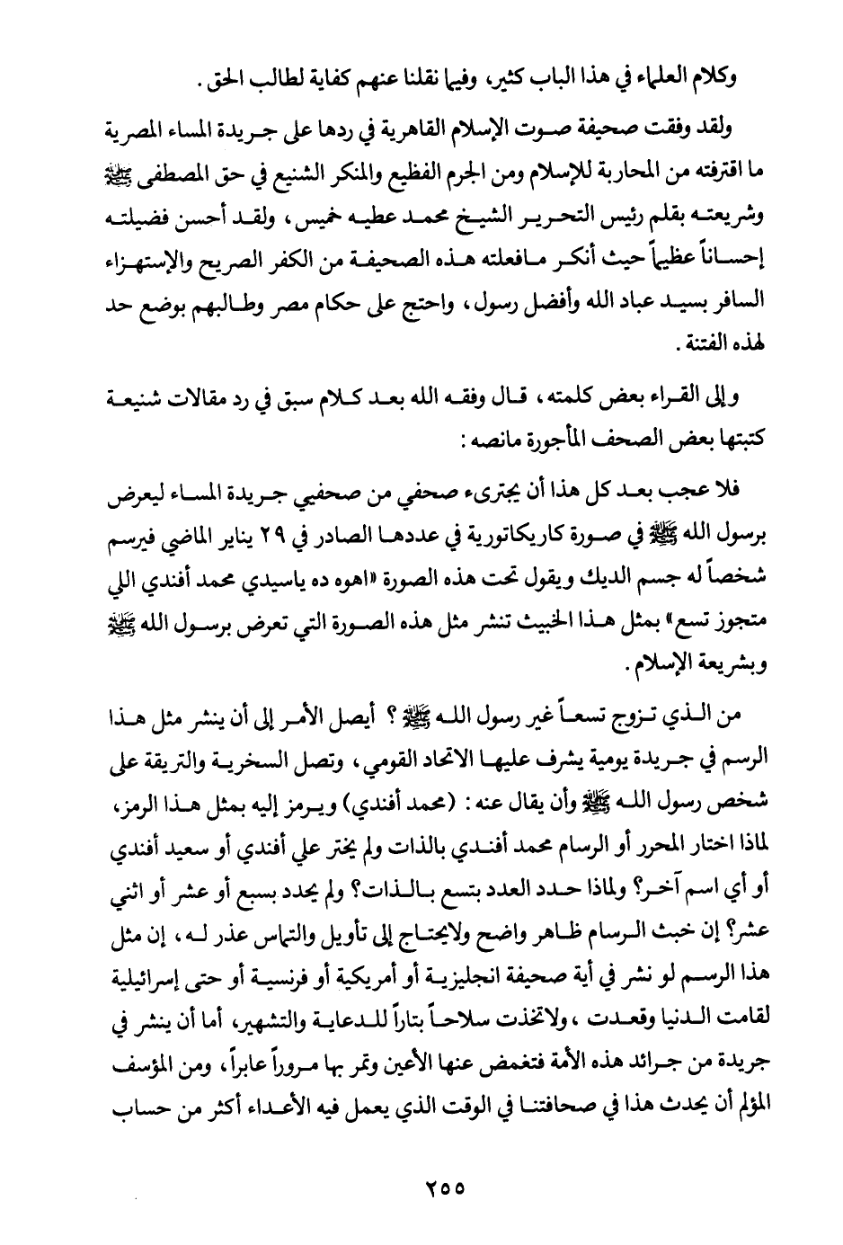 من الذي تزوج تسعا غير رسول الله؟ أيصل الأمر إلى أن ينشر مثل هذا الرسم في جريدة يومية يشرف عليها الاتحاد القومي، وتصل السخرية والتريقة على شخص رسول الله وأن يقال عنه: (محمد أفندي) ويرمز إليه بمثل هذا الرمز، لماذا اختار المحرر أو الرسام محمد أفندي بالذات ولم يختر علي أفندي أو سعيد أفندي أو أي اسم آخر؟ ولماذا حدد العدد بتسع بالذات؟ ولم يحدد بسبع أو عشر أو اثني عشر؟ إن خبث الرسام ظاهر واضح ولا يحتاح إلى تأويل والتماس عذر له.