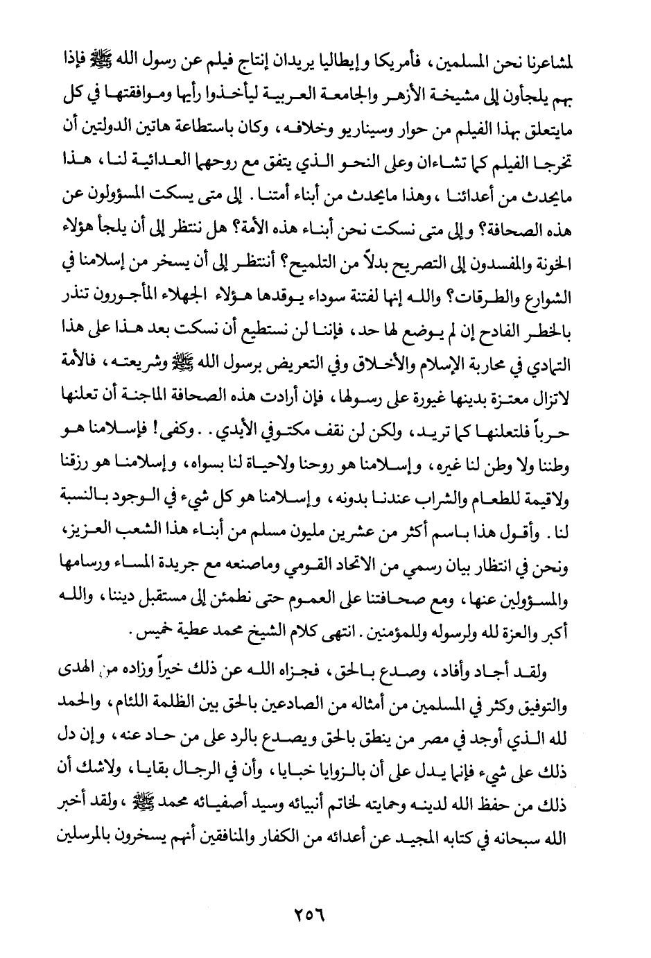 فإسلامنا هو وطننا ولا وطن لنا غيره، وإسلامنا هو روحنا ولا حياة لنا بسواه، وإسلامنا هو رزقنا ولا قيمة للطعام والشراب عندنا بدونه، وإسلامنا هو كل شيء في الوجود بالنسبة لنا، وأقول هذا باسم أكثر من عشرين مليون مسلم من أبناء هذا الشعب العزيز، ونحن في انتظار بيان رسمي من الاتحاد القومي وما صنعه مع جريدة المساء ورسامها والمسئولين عنها، ومع صحافتنا على العموم حتى نطمئن إلى مستقبل ديننا، والله أكبر والعزة لله ولرسوله وللمؤمنين.