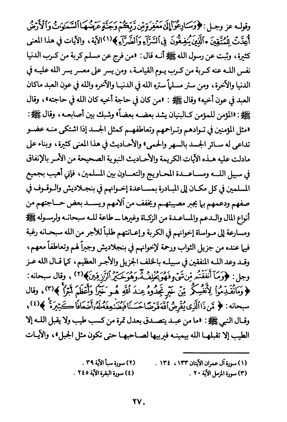 وقوله عز وجل: {وَسَارِعُوا إِلَى مَغْفِرَةٍ مِنْ رَبِّكُمْ وَجَنَّةٍ عَرْضُهَا السَّمَاوَاتُ وَالْأَرْضُ أُعِدَّتْ لِلْمُتَّقِينَ} (¬1) {الَّذِينَ يُنْفِقُونَ فِي السَّرَّاءِ وَالضَّرَّاءِ} (¬2) الآية، والآيات في هذا المعنى كثيرة، وثبت عن رسول الله صلى الله عليه وسلم أنه قال: «من فرج عن مسلم كربة من كرب الدنيا نفس الله عنه كربة من كرب يوم القيامة ومن يسر على معسر يسر الله عليه في الدنيا والآخرة، ومن ستر مسلما ستره الله في الدنيا والآخره، والله في عون العبد ما كان العبد في عون أخيه (¬3) » وقال صلى الله عليه وسلم: «من كان في حاجة أخيه كان الله في حاجته (¬4) » وقال صلى الله عليه وسلم: «المؤمن للمؤمن كالبنيان يشد بعضه بعضا وشبك بين أصابعه (¬5) » وقال صلى الله عليه وسلم: «مثل المؤمنين في توادهم وتراحمهم وتعاطفهم كمثل الجسد إذا اشتكى منه عضو تداعى له سائر الجسد بالسهر والحمى (¬6) » والأحاديث في هذا المعنى كثيرة، وبناء على ما دلت عليه هذه الآيات الكريمة والأحاديث النبوية الصحيحة من الأمر بالإنفاق في سبيل الله ومساعدة المحاويج والتعاون بين المسلمين، فإني أهيب بجميع المسلمين في كل مكان إلى المبادرة بمساعدة إخوانهم في بنجلاديش والوقوف في صفهم ودعمهم بما يجبر مصيبتهم ويخفف من آلامهم ويسد بعض حاجتهم من أنواع المال والدعم والمساعدة من الزكاة وغيرها - طاعة لله سبحانه ولرسوله صلى الله عليه وسلم ومسارعة إلى مواساة إخوانهم في الكربة وإعانتهم طلبا للأجر من الله سبحانه رغبة فيما عنده من جزيل الثواب، ورحمة لإخوانهم في بنجلاديش، وجبرا لهم وتعاطفا معهم، وقد وعد الله المنفقين في سبيله بالخلف الجزيل والأجر العظيم، كما قال الله عز وجل: {وَمَا أَنْفَقْتُمْ مِنْ شَيْءٍ فَهُوَ يُخْلِفُهُ وَهُوَ خَيْرُ الرَّازِقِينَ} (¬7) وقال سبحانه: {لِأَنْفُسِكُمْ مِنْ خَيْرٍ تَجِدُوهُ عِنْدَ اللَّهِ هُوَ خَيْرًا وَأَعْظَمَ أَجْرًا} (¬8) وقال سبحانه: {مَنْ ذَا الَّذِي يُقْرِضُ اللَّهَ قَرْضًا حَسَنًا فَيُضَاعِفَهُ لَهُ أَضْعَافًا كَثِيرَةً} (¬9) وقال النبي صلى الله عليه وسلم: «ما من عبد يتصدق بعدل تمرة من كسب طيب، ولا يقبل الله إلا الطيب، إلا تقبلها الله بيمينه فيربيها لصاحبها حتى تكون مثل الجبل (¬10) » والآيات