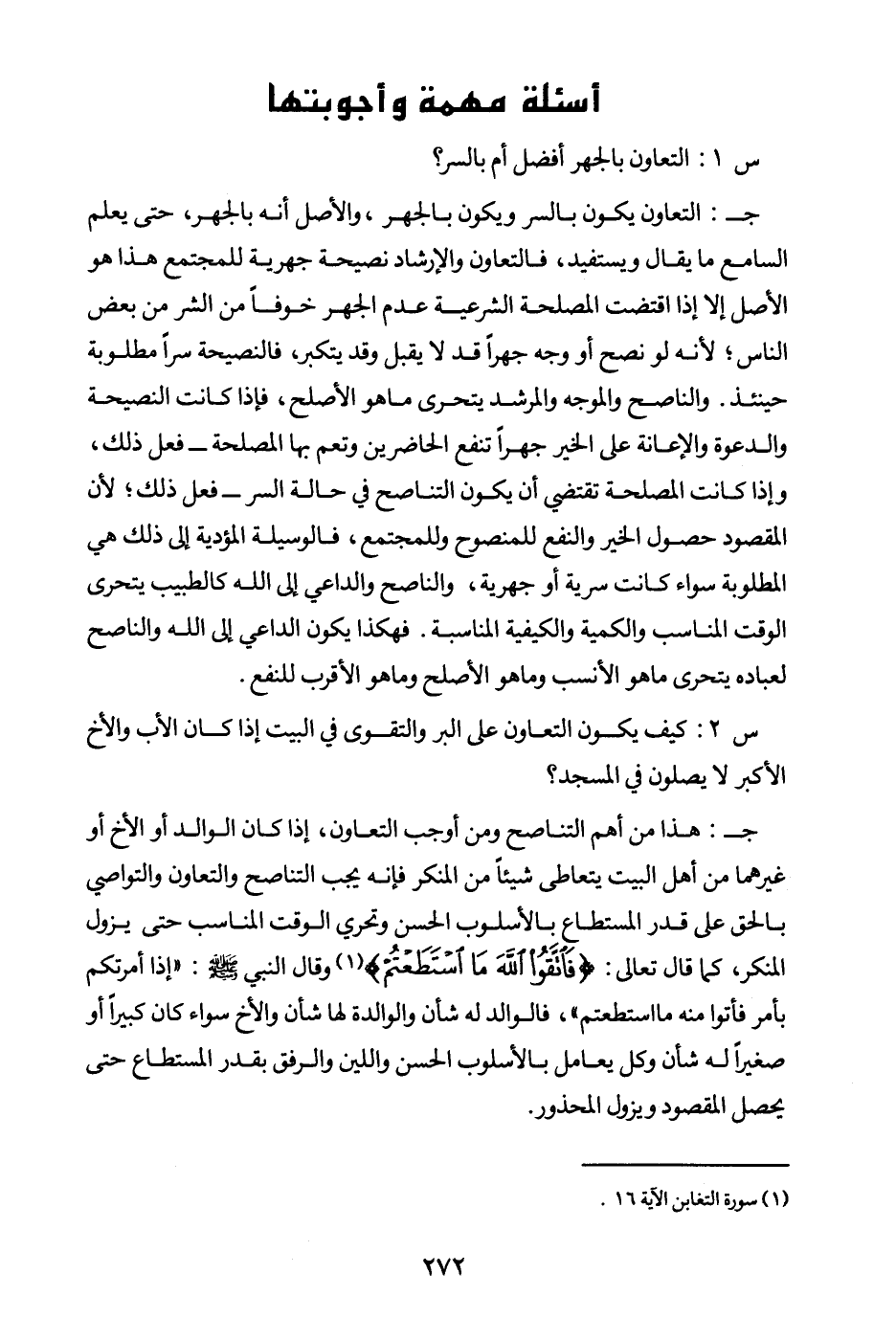 جـ: التعاون يكون بالسر ويكون بالجهر، والأصل أنه بالجهر، حتى يعلم السامع ما يقال ويستفيد، فالتعاون والإرشاد نصيحة جهرية للمجتمع هذا هو الأصل إلا إذا اقتضت المصلحة الشرعية عدم الجهر خوفا من الشر من بعض الناس؛ لأنه لو نصح أو وجه جهرا قد لا يقبل وقد يتكبر، فالنصيحة سرا مطلوبة حينئذ. والناصح والموجه والمرشد يتحرى ما هو الأصلح، فإذا كانت النصيحة والدعوة والإعانة على الخير جهرا تنفع الحاضرين وتعم بها المصلحة - فعل ذلك، وإذا كانت المصلحة تقتضي أن يكون التناصح في حالة السر - فعل ذلك؛ لأن المقصود حصول الخير والنفع للمنصوح وللمجتمع، فالوسيلة المؤدية إلى ذلك هي المطلوبة سواء كانت سرية أو جهرية، والناصح والداعي إلى الله كالطبيب يتحرى الوقت المناسب والكمية والكيفية المناسبة. فهكذا يكون الداعي إلى الله والناصح لعباده يتحرى ما هو الأنسب وما هو الأصلح وما هو الأقرب للنفع.