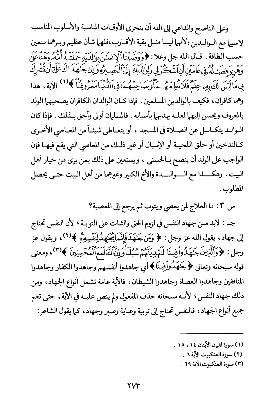 جـ: لا بد من جهاد النفس في لزوم الحق والثبات على التوبة؛ لأن النفس تحتاج إلى جهاد، يقول الله عز وجل: {وَمَنْ جَاهَدَ فَإِنَّمَا يُجَاهِدُ لِنَفْسِهِ} (¬1) ويقول عز وجل: {وَالَّذِينَ جَاهَدُوا فِينَا لَنَهْدِيَنَّهُمْ سُبُلَنَا وَإِنَّ اللَّهَ لَمَعَ الْمُحْسِنِينَ} (¬2) ومعنى قوله سبحانه وتعالى {جَاهَدُوا فِينَا} (¬3) أي جاهدوا أنفسهم وجاهدوا الكفار وجاهدوا المنافقين وجاهدوا العصاة وجاهدوا الشيطان، فالآية عامة تشمل أنواع الجهاد، ومن ذلك جهاد النفس؛ لأنه سبحانه حذف المفعول ولم ينص عليه في الآية، حتى تعم جميع أنواع الجهاد، فالنفس تحتاج إلى تربية وعناية وصبر وجهاد، كما يقول الشاعر: