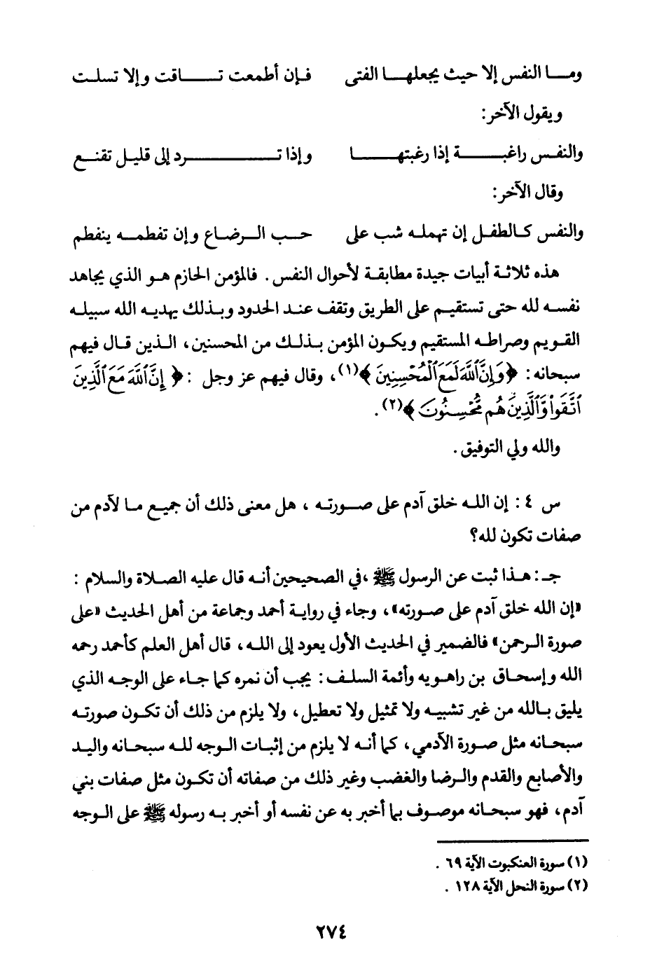 هذه ثلاثة أبيات جيدة مطابقة لأحوال النفس، فالمؤمن الحازم هو الذي يجاهد نفسه لله حتى تستقيم على الطريق وتقف عند الحدود، وبذلك يهديه الله سبيله القويم وصراطه المستقيم، ويكون المؤمن بذلك من المحسنين، الذين قال فيهم سبحانه: {وَإِنَّ اللَّهَ لَمَعَ الْمُحْسِنِينَ} (¬1) وقال فيهم عز وجل: {إِنَّ اللَّهَ مَعَ الَّذِينَ اتَّقَوْا وَالَّذِينَ هُمْ مُحْسِنُونَ} (¬2)