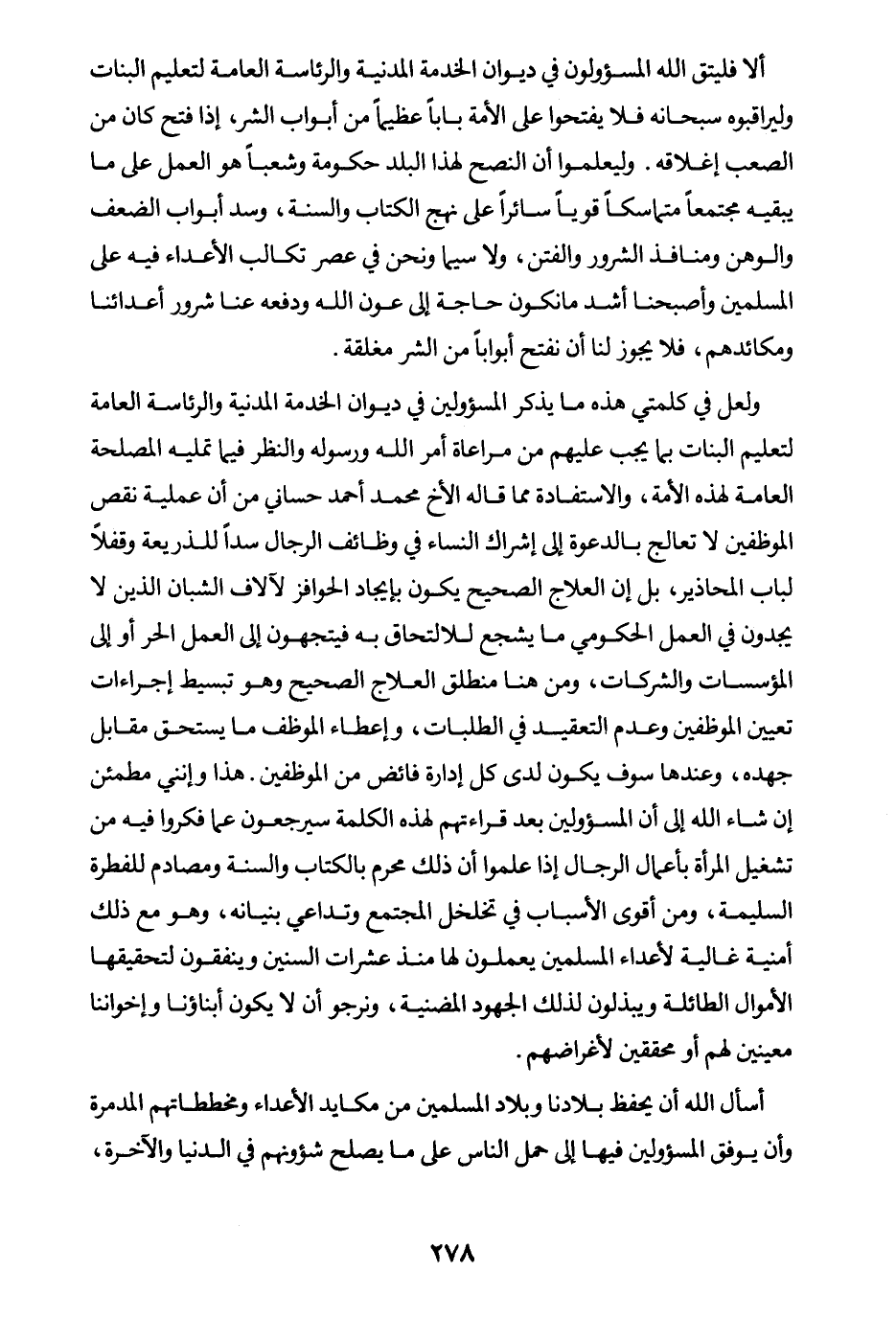 ألا فليتق الله المسئولون في ديوان الخدمة المدنية والرئاسة العامة لتعليم البنات، وليراقبوه سبحانه فلا يفتحوا على الأمة بابا عظيما من أبواب الشر، إذا فتح كان من الصعب إغلاقه، وليعلموا أن النصح لهذا البلد حكومة وشعبا هو العمل على ما يبقيه مجتمعا متماسكا قويا سائرا على نهج الكتاب والسنة، وسد أبواب الضعف والوهن ومنافذ الشرور والفتن، ولا سيما ونحن في عصر تكالب الأعداء فيه على المسلمين وأصبحنا أشد ما نكون حاجة إلى عون الله ودفعه عنا شرور أعدائنا ومكائدهم، فلا يجوز لنا أن نفتح أبوابا من الشر مغلقة.