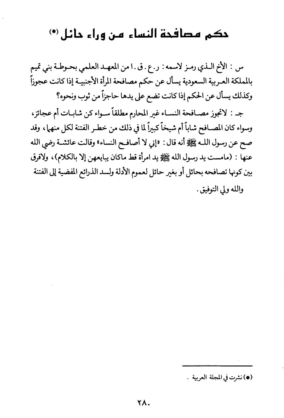 جـ: لاتجوز مصافحة النساء غير المحارم مطلقا سواء كن شابات أم عجائز، وسواء كان المصافح شابا أم شيخا كبيرا لما في ذلك من خطر الفتنة لكل منهما، وقد صح عن رسول الله صلى الله عليه وسلم أنه قال: «إني لا أصافح النساء (¬2) » وقالت عائشة رضي الله عنها: «ما مست يد رسول الله صلى الله عليه وسلم يد امرأة قط ما كان يبايعهن إلا بالكلام (¬3) » ولا فرق بين كونها تصافحه بحائل أو بغير حائل لعموم الأدلة، ولسد الذرائع المفضية إلى الفتنة والله ولي التوفيق.