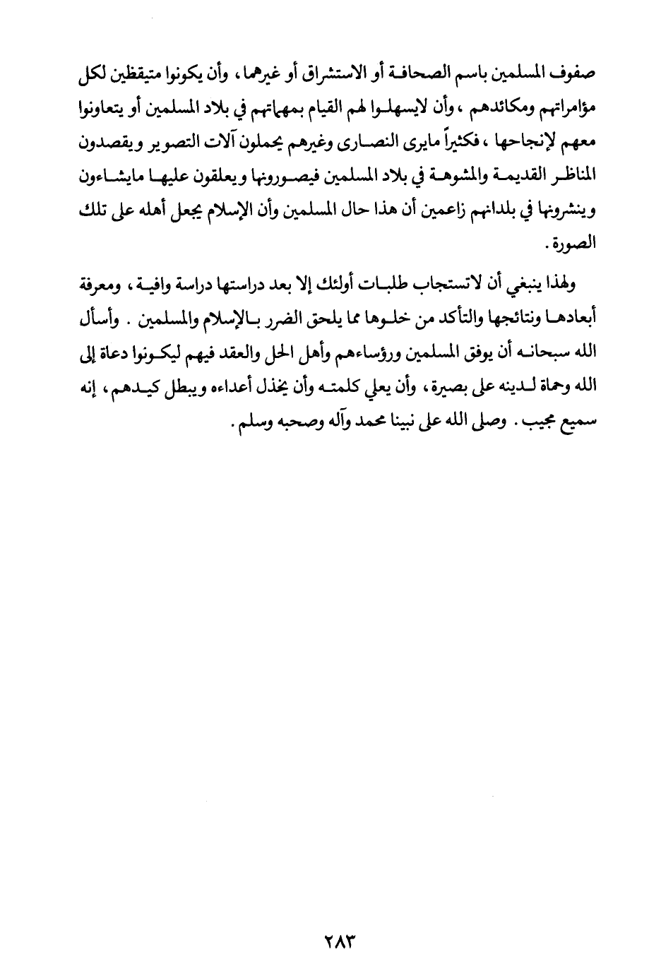 ولهذا ينبغي أن لا تستجاب طلبات أولئك إلا بعد دراستها دراسة وافية، ومعرفة أبعادها ونتائجها والتأكد من خلوها مما يلحق الضرر بالإسلام والمسلمين. وأسأل الله سبحانه أن يوفق المسلمين ورؤساءهم وأهل الحل والعقد فيهم؛ ليكونوا دعاة إلى الله وحماة لدينه على بصيرة، وأن يعلي كلمته وأن يخذل أعداءه ويبطل كيدهم، إنه سميع مجيب. وصلى الله على نبينا محمد وآله وصحبه وسلم.
