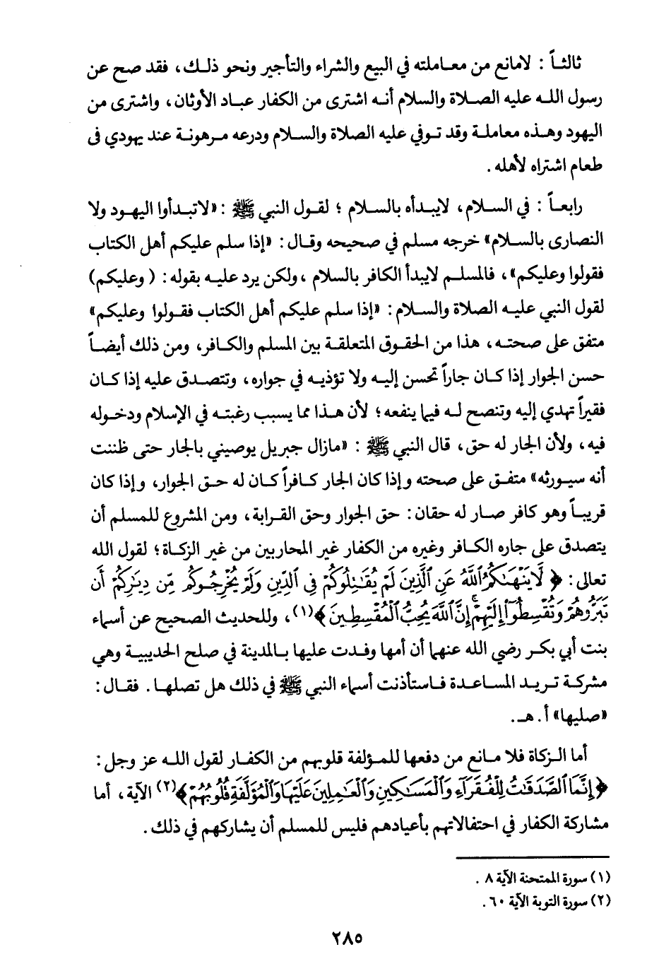 رابعا: في السلام، لا يبدأه بالسلام؛ لقول النبي صلى الله عليه وسلم: «لا تبدءوا اليهود ولا النصارى بالسلام (¬1) » خرجه مسلم في صحيحه وقال: «إذا سلم عليكم أهل الكتاب فقولوا: وعليكم (¬2) » فالمسلم لا يبدأ الكافر بالسلام، ولكن يرد عليه بقوله: (وعليكم) لقول النبي عليه الصلاة والسلام: «إذا سلم عليكم أهل الكتاب فقولوا: وعليكم (¬3) » متفق على صحته، هذا من الحقوق المتعلقة بين المسلم والكافر، ومن ذلك أيضا حسن الجوار إذا كان جارا تحسن إليه ولا تؤذيه في جواره، وتتصدق عليه إذا كان فقيرا تهدي إليه وتنصح له فيما ينفعه؛ لأن هذا مما يسبب رغبته في الإسلام ودخوله فيه؛ ولأن الجار له حق، قال النبي صلى الله عليه وسلم: «مازال جبريل يوصيني بالجار حتى طننت أنه سيورثه (¬4) » متفق على صحته وإذا كان الجار كافرا كان له حق الجوار، وإذا كان قريبا وهو كافر صار له حقان: حق الجوار وحق القرابة، ومن المشروع للمسلم أن يتصدق على جاره الكافر وغيره من الكفار غير المحاربين من غير الزكاة. لقول الله تعالى: {لَا يَنْهَاكُمُ اللَّهُ عَنِ الَّذِينَ لَمْ يُقَاتِلُوكُمْ فِي الدِّينِ وَلَمْ يُخْرِجُوكُمْ مِنْ دِيَارِكُمْ أَنْ تَبَرُّوهُمْ وَتُقْسِطُوا إِلَيْهِمْ إِنَّ اللَّهَ يُحِبُّ الْمُقْسِطِينَ} (¬5) وللحديث الصحيح «عن أسماء بنت أبي بكر رضي الله عنهما أن أمها وفدت عليها بالمدينة في صلح الحديبية وهي مشركة تريد المساعدة، فاستأذنت أسماء النبي صلى الله عليه وسلم في ذلك هل تصلها؟ فقال: صليها (¬6) » اهـ.