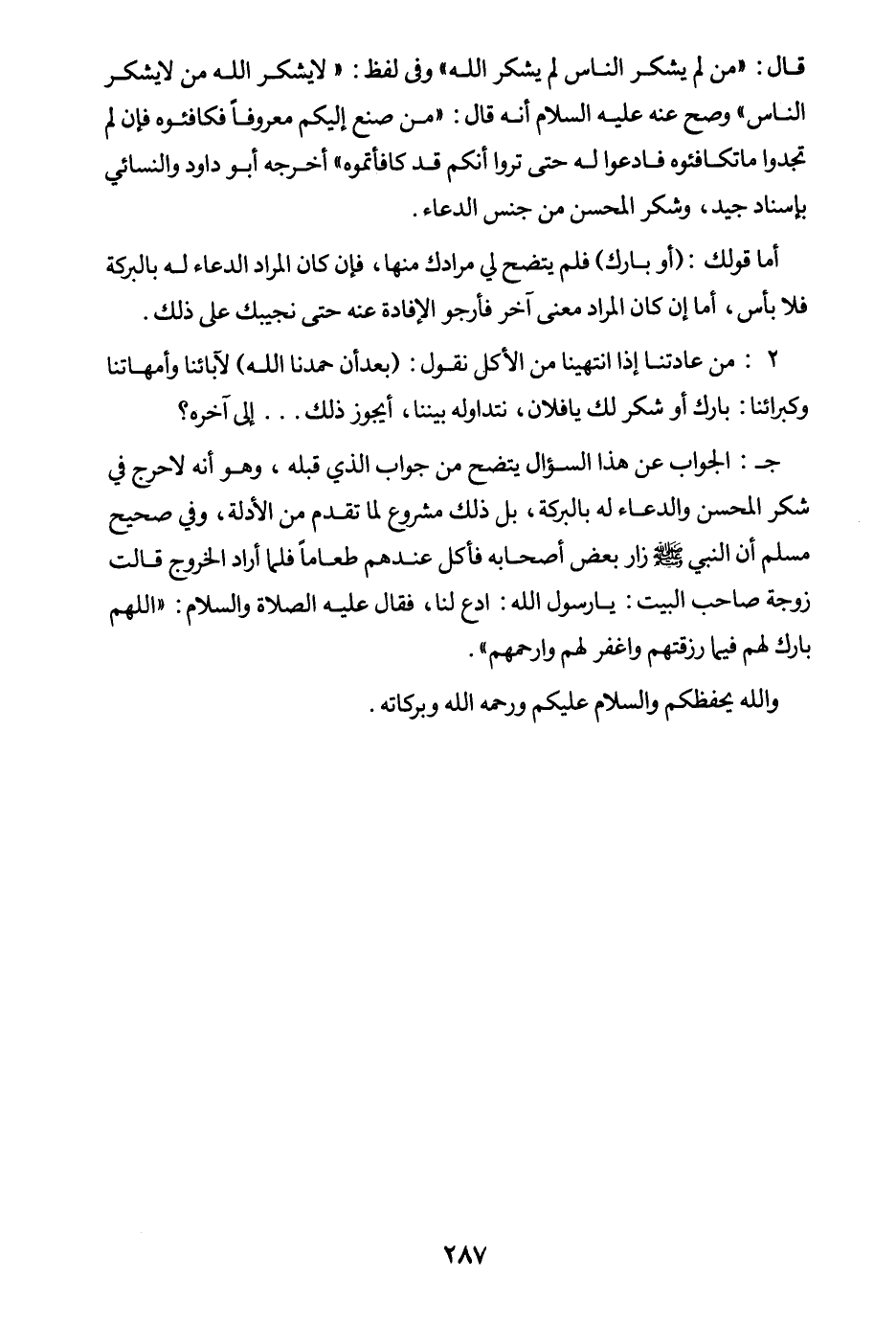 جـ: الجواب عن هذا السؤال يتضح من جواب الذي قبله، وهو أنه لا حرج في شكر المحسن والدعاء له بالبركة، بل ذلك مشروع لما تقدم من الأدلة، وفي صحيح مسلم أن النبي زار بعض أصحابه فأكل عندهم طعاما فلما أراد الخروج قالت زوجة صاحب البيت: يا رسول الله: ادع لنا، فقال عليه الصلاة والسلام: «اللهم بارك لهم فيما رزقتهم واغفر لهم وارحمهم» .