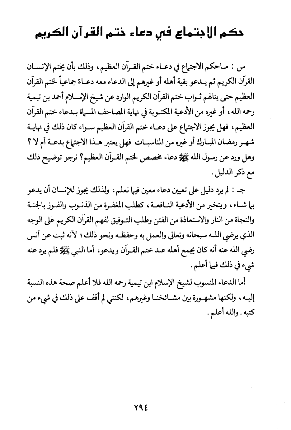 س: ما حكم الاجتماع في دعاء ختم القرآن العظيم، وذلك بأن يختم الإنسان القرآن الكريم ثم يدعو بقية أهله أو غيرهم إلى الدعاء معه دعاء جماعيا لختم القرآن العظيم حتى ينالهم ثواب ختم القرآن الكريم الوارد عن شيخ الإسلام أحمد ابن تيمية رحمه الله، أو غيره من الأدعية المكتوبة في نهاية المصاحف المسماة بدعاء ختم القرآن العظيم، فهل يجوز الاجتماع على دعاء ختم القرآن العظيم سواء كان ذلك في نهاية شهر رمضان المبارك أو غيره من المناسبات فهل يعتبر هذا الاجتماع بدعة أم لا؟ وهل ورد عن رسول الله صلى الله عليه وسلم دعاء مخصص لختم القرآن العظيم؟ نرجو توضيح ذلك مع ذكر الدليل.