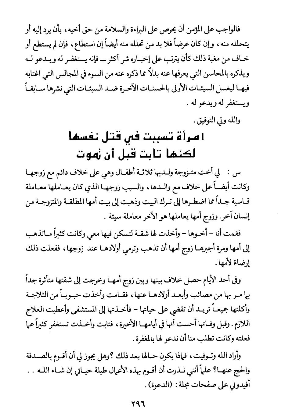 وفي أحد الأيام حصل خلاف بينها وبين زوج أمها وخرجت إلى شقتها متأثرة جدا بما مر بها من مصائب وأبعد أولادها عنها، فقامت وأخذت حبوبا من الثلاجة وأكلتها جميعا تريد أن تقضي على حياتها - فأخذتها إلى المستشفى وأعطيت العلاج اللازم، وقبل وفاتها أحست أنها في أيامها الأخيرة، فتابت وأخذت تستغفر كثيرا عما فعلته وكانت تطلب منا أن ندعو لها بالمغفرة. وأراد الله وتوفيت، فماذا يكون حالها بعد ذلك؟