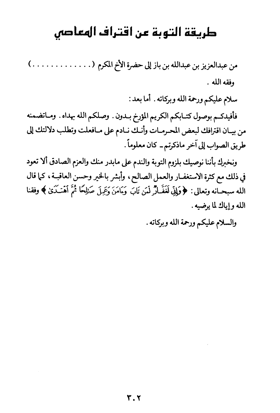 فأفيدكم بوصول كتابكم الكريم المؤرخ بدون. وصلكم الله بهداه. وما تضمنه من بيان اقترافك لبعض المحرمات وأنك نادم على ما فعلت، وتطلب دلالتك إلى طريق الصواب إلى آخر ما ذكرتم - كان معلوما.