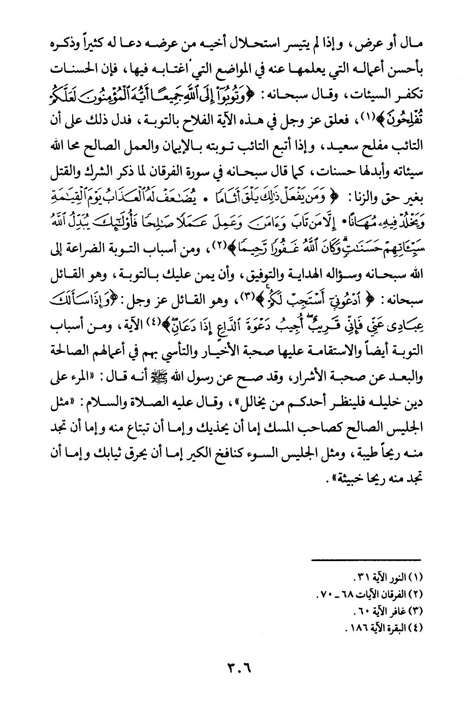 مال أو عرض، وإذا لم يتيسر استحلال أخيه من عرضه دعا له كثيرا وذكره بأحسن أعماله التي يعلمها عنه في المواضع التي اغتابه فيها، فإن الحسنات تكفر السيئات، وقال سبحانه: {وَتُوبُوا إِلَى اللَّهِ جَمِيعًا أَيُّهَ الْمُؤْمِنُونَ لَعَلَّكُمْ تُفْلِحُونَ} (¬1) فعلق عز وجل في هذه الآية الفلاح بالتوبة، فدل ذلك على أن التائب مفلح سعيد، وإذا أتبع التائب توبته بالإيمان والعمل الصالح محا الله سيئاته وأبدلها حسنات، كما قال سبحانه في سورة الفرقان لما ذكر الشرك والقتل بغير حق والزنا: {وَمَنْ يَفْعَلْ ذَلِكَ يَلْقَ أَثَامًا} (¬2) {يُضَاعَفْ لَهُ الْعَذَابُ يَوْمَ الْقِيَامَةِ وَيَخْلُدْ فِيهِ مُهَانًا} (¬3) {إِلَّا مَنْ تَابَ وَآمَنَ وَعَمِلَ عَمَلًا صَالِحًا فَأُولَئِكَ يُبَدِّلُ اللَّهُ سَيِّئَاتِهِمْ حَسَنَاتٍ وَكَانَ اللَّهُ غَفُورًا رَحِيمًا} (¬4)