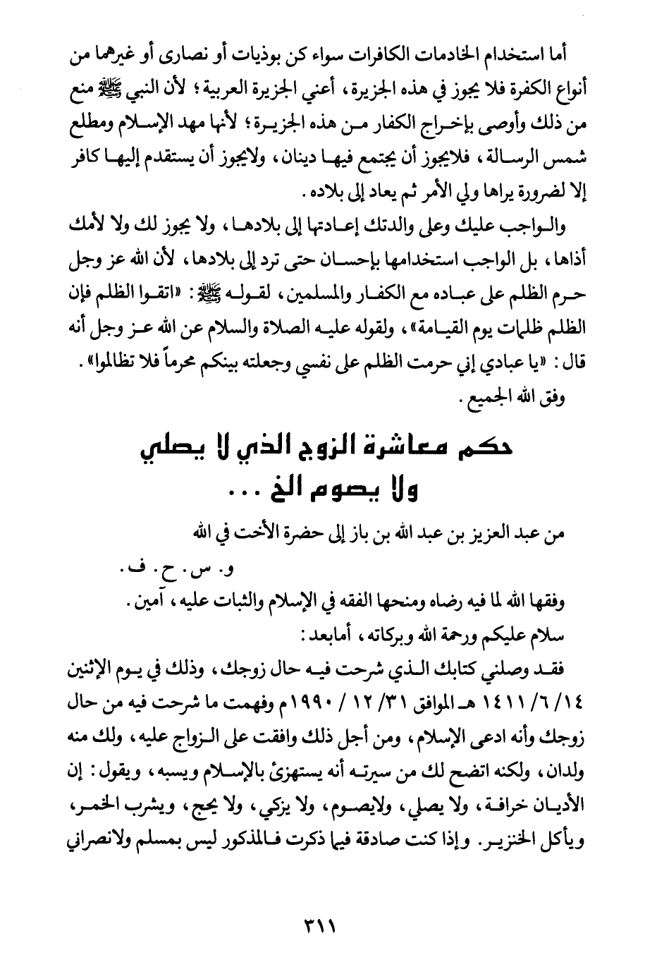فقد وصلني كتابك الذي شرحت فيه حال زوجك، وذلك في يوم الاثنين 14 \ 6 \ 1411 هـ الموافق 31 \ 12 \ 1990 م وفهمت ما شرحت فيه من حال زوجك وأنه ادعى الإسلام، ومن أجل ذلك وافقت على الزواج عليه، ولك منه ولدان، ولكنه اتضح لك من سيرته أنه يستهزئ بالإسلام ويسبه، ويقول: إن الأديان خرافة، ولا يصلي، ولا يصوم، ولا يزكي، ولا يحج، ويشرب الخمر، ويأكل الخنزير.