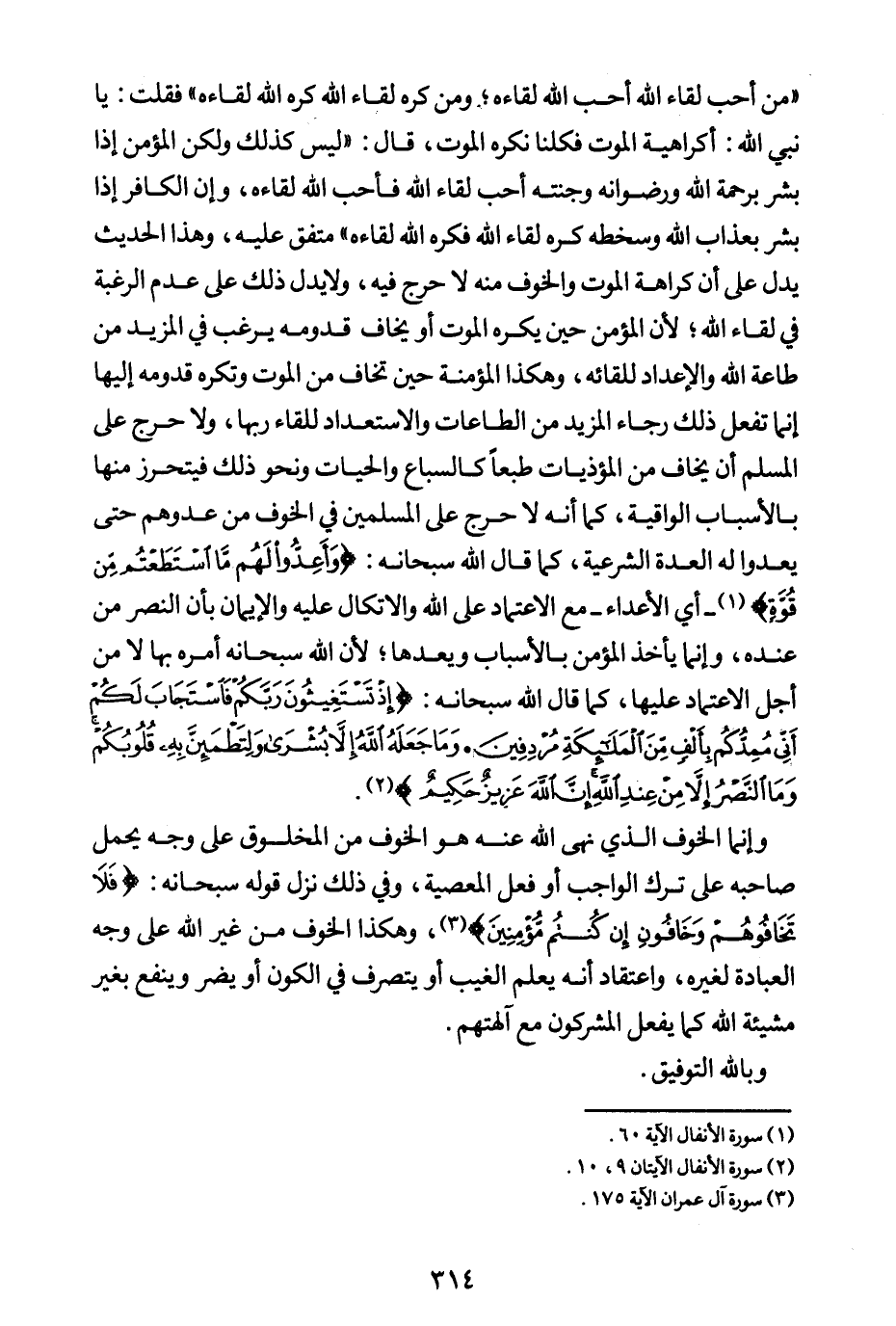 وإنما الخوف الذي نهى الله عنه هو الخوف من المخلوق على وجه يحمل صاحبه على ترك الواجب أو فعل المعصية، وفي ذلك نزل قوله سبحانه: {فَلَا تَخَافُوهُمْ وَخَافُونِ إِنْ كُنْتُمْ مُؤْمِنِينَ} (¬5) وهكذا الخوف من غير الله على وجه العبادة لغيره، واعتقاد أنه يعلم الغيب أو يتصرف في الكون أو يضر وينفع بغير مشيئة الله كما يفعل المشركون مع آلهتهم.
