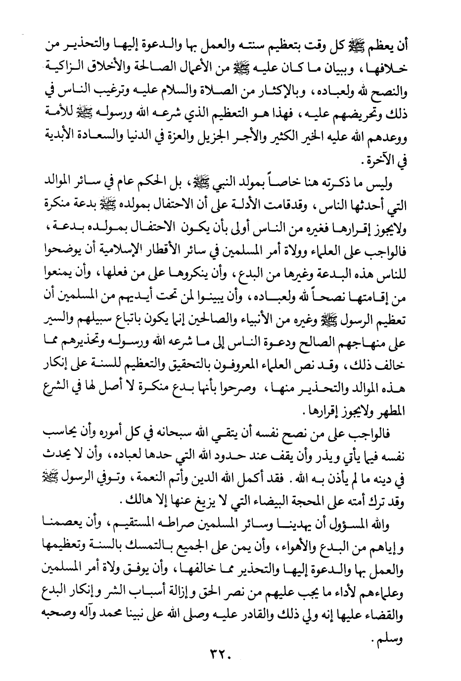 وليس ما ذكرته هنا خاصا بمولد النبي صلى الله عليه وسلم، بل الحكم عام في سائر الموالد التي أحدثها الناس، وقد قامت الأدلة على أن الاحتفال بمولده صلى الله عليه وسلم بدعة منكرة، ولا يجوز إقرارها فغيره من الناس أولى بأن يكون الاحتفال بمولده بدعة، فالواجب على العلماء وولاة أمر المسلمين في سائر الأقطار الإسلامية أن يوضحوا للناس هذه البدعة وغيرها من البدع، وأن ينكروها على من فعلها، وأن يمنعوا من إقامتها نصحا لله ولعباده، وأن يبينوا لمن تحت أيديهم من المسلمين أن تعظيم الرسول صلى الله عليه وسلم وغيره من الأنبياء والصالحين إنما يكون باتباع سبيلهم، والسير على منهاجهم الصالح، ودعوة الناس إلى ما شرعه الله ورسوله، وتحذيرهم مما خالف ذلك، وقد نص العلماء المعروفون بالتحقيق والتعظيم للسنة على إنكار هذه الموالد والتحذير منها، وصرحوا بأنها بدع منكرة لا أصل لها في الشرع المطهر ولا يجوز إقرارها.