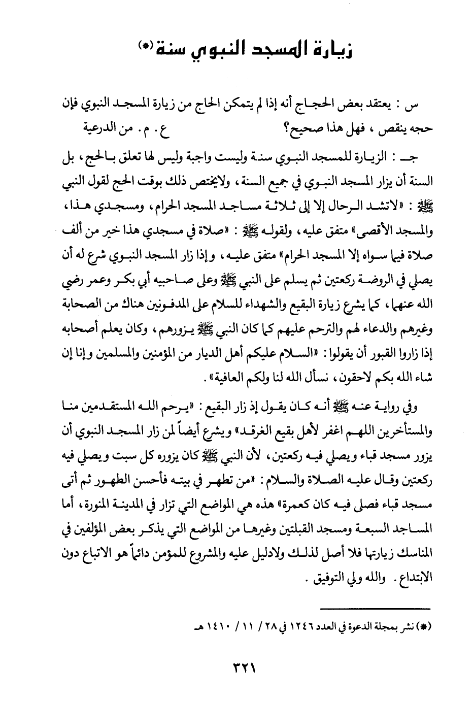 جـ: الزيارة للمسجد النبوي سنة وليست واجبة، وليس لها تعلق بالحج، بل السنة أن يزار المسجد النبوي في جميع السنة، ولا يختص ذلك بوقت الحج لقول النبي صلى الله عليه وسلم: «لا تشد الرحال إلا إلى ثلاثة مساجد المسجد الحرام، ومسجدي هذا، والمسجد الأقصى (¬2) » متفق عليه، ولقوله صلى الله عليه وسلم: «صلاة في مسجدي هذا خير من ألف صلاة فيما سواه إلا المسجد الحرام (¬3) » متفق عليه.