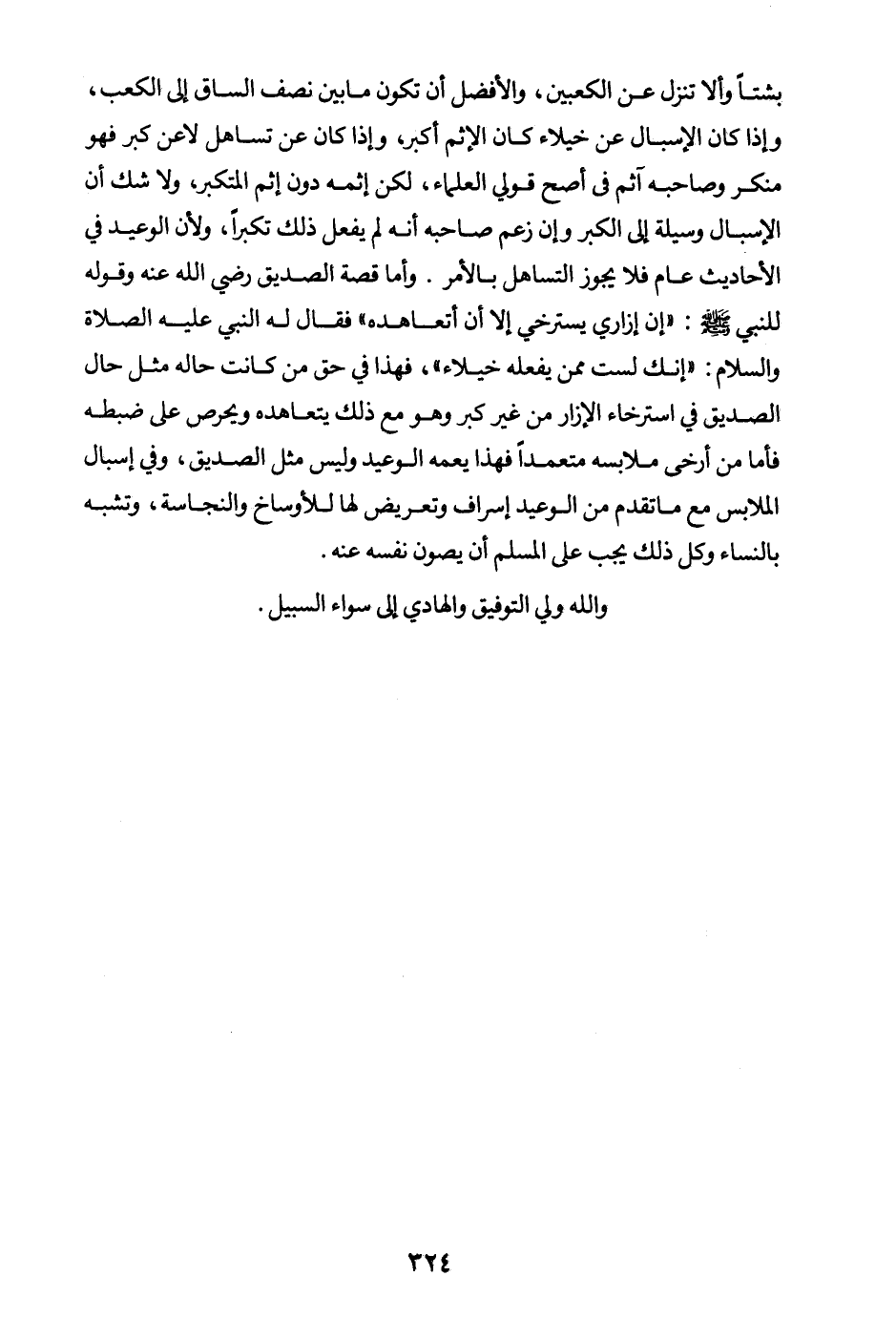 وأما قصة الصديق رضي الله عنه وقوله للنبي صلى الله عليه وسلم: «إن إزاري يسترخي إلا أن أتعاهده فقال له النبي عليه الصلاة والسلام: إنك لست ممن يفعله خيلاء (¬1) » فهذا في حق من كانت حاله مثل حال الصديق في استرخاء الإزار من غير كبر، وهو مع ذلك يتعاهده ويحرص على ضبطه فأما من أرخى ملابسه متعمدا فهذا يعمه الوعيد وليس مثل الصديق.