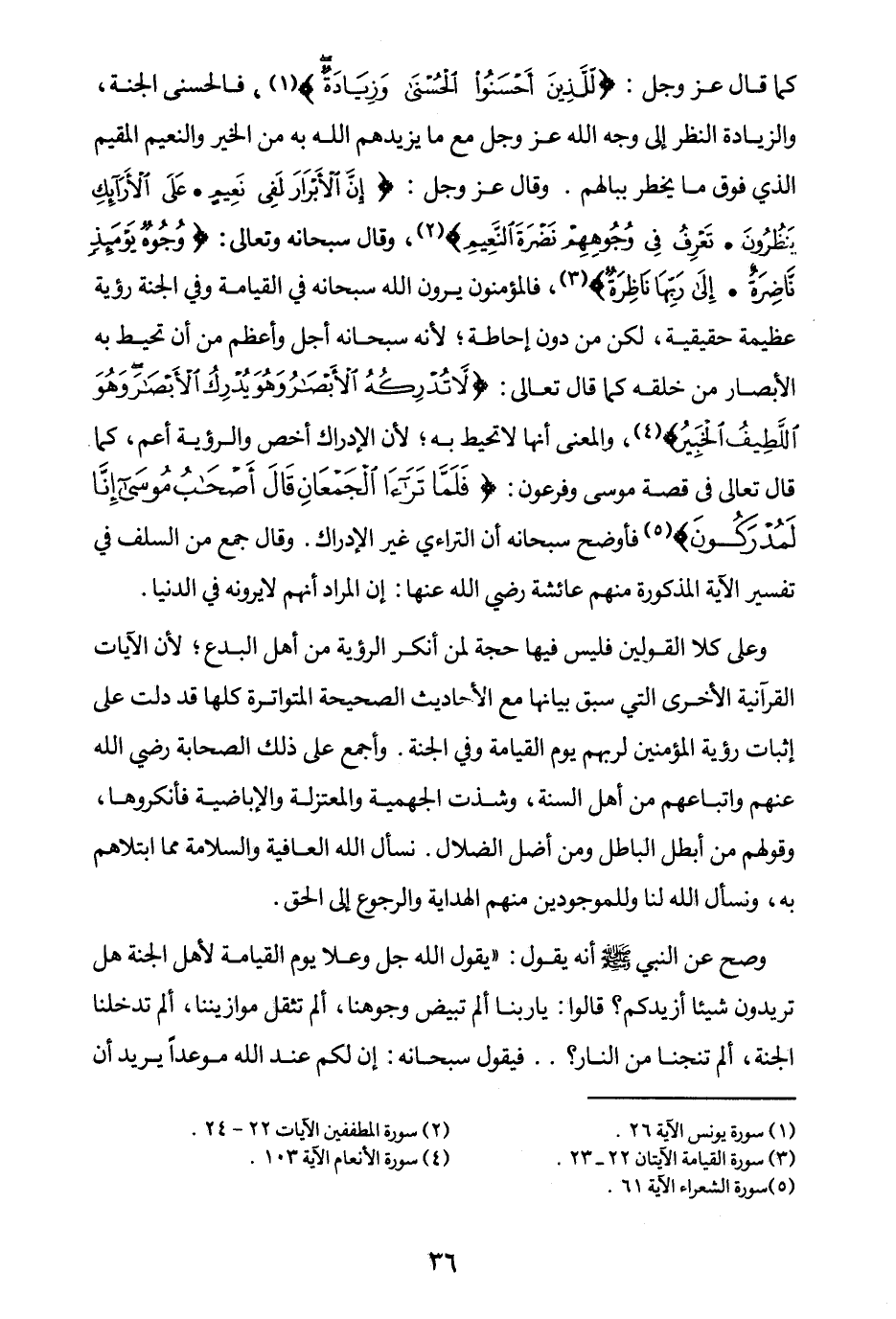 كما قال عز وجل: {لِلَّذِينَ أَحْسَنُوا الْحُسْنَى وَزِيَادَةٌ} (¬1) فالحسنى الجنة والزيادة النظر إلى وجه الله عز وجل مع ما يزيدهم الله به من الخير والنعيم المقيم الذي فوق ما يخطر ببالهم. وقال عز وجل: {إِنَّ الْأَبْرَارَ لَفِي نَعِيمٍ} (¬2) {عَلَى الْأَرَائِكِ يَنْظُرُونَ} (¬3) {تَعْرِفُ فِي وُجُوهِهِمْ نَضْرَةَ النَّعِيمِ} (¬4) وقال سبحانه وتعالى: {وُجُوهٌ يَوْمَئِذٍ نَاضِرَةٌ} (¬5) {إِلَى رَبِّهَا نَاظِرَةٌ} (¬6)
