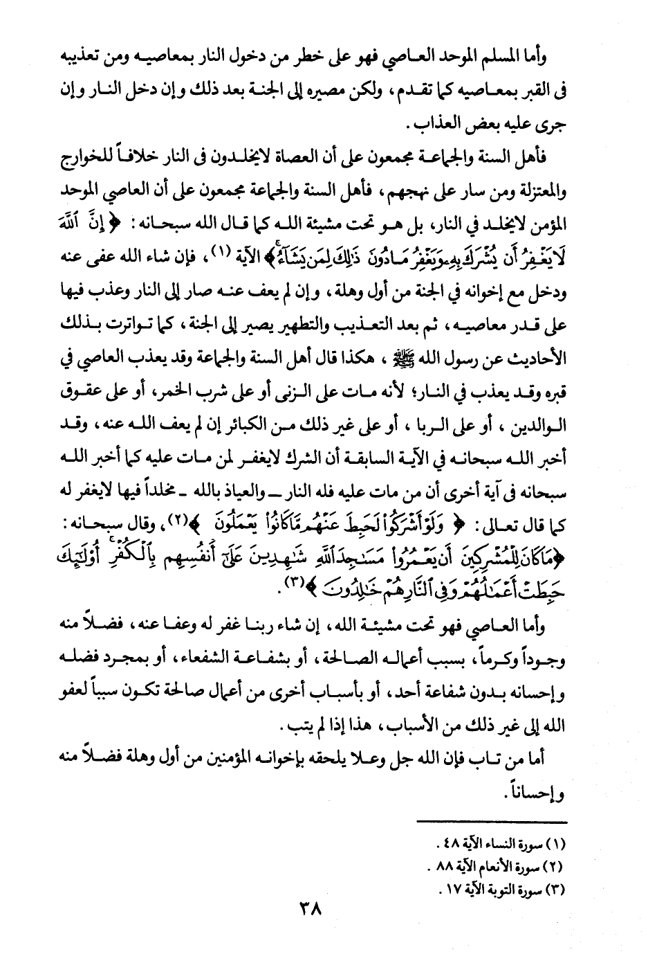 فأهل السنة والجماعة مجمعون على أن العصاة لا يخلدون في النار خلافا للخوارج والمعتزلة ومن سار على نهجهم، فأهل السنة والجماعة مجمعون على أن العاصي الموحد المؤمن لا يخلد في النار بل هو تحت مشيئة الله، كما قال الله سبحانه: {إِنَّ اللَّهَ لَا يَغْفِرُ أَنْ يُشْرَكَ بِهِ وَيَغْفِرُ مَا دُونَ ذَلِكَ لِمَنْ يَشَاءُ} (¬1) فإن شاء الله عفى عنه ودخل مع إخوانه في الجنة من أول وهلة، وإن لم يعف عنه صار إلى النار وعذب فيها على قدر معاصيه، ثم بعد التعذيب والتطهير يصير إلى الجنة، كما تواترت بذلك الأحاديث عن رسول الله صلى الله عليه وسلم.
