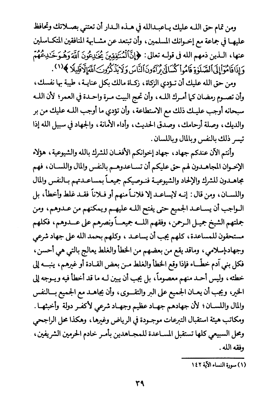أن تعتني بصلاتك وتحافظ عليها في جماعة مع إخوانك المسلمين، وأن تبتعد عن مشابهة المنافقين المتكاسلين عنها، الذين ذمهم الله في قوله تعالى: {إِنَّ الْمُنَافِقِينَ يُخَادِعُونَ اللَّهَ وَهُوَ خَادِعُهُمْ وَإِذَا قَامُوا إِلَى الصَّلَاةِ قَامُوا كُسَالَى يُرَاءُونَ النَّاسَ وَلَا يَذْكُرُونَ اللَّهَ إِلَّا قَلِيلًا} (¬1)