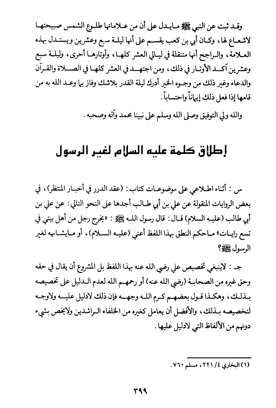 س: أثناء اطلاعي على موضوعات كتاب: (عقد الدرر في أخبار المنتظر) ، في بعض الروايات المنقولة عن علي بن أبي طالب أجدها على النحو التالي: عن علي بن أبي طالب (عليه السلام) قال: قال رسول الله صلى الله عليه وسلم: «يخرج رجل من أهل بيتي في تسع رايات» ما حكم النطق بهذا اللفظ أعني (عليه السلام) ، أو ما يشابهه لغير الرسول صلى الله عليه وسلم؟