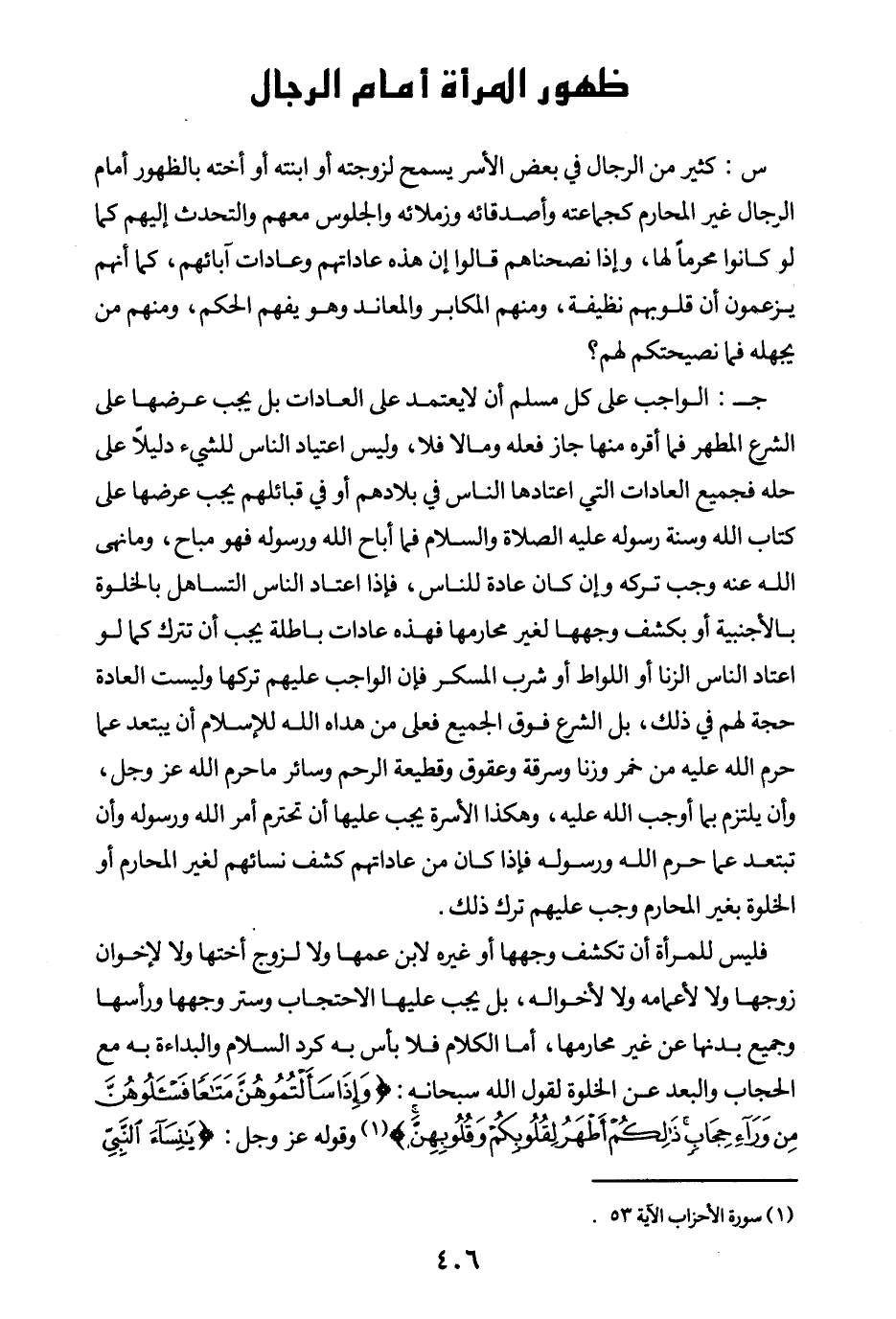 س: كثير من الرجال في بعض الأسر يسمح لزوجته أو ابنته أو أخته بالظهور أمام الرجال غير المحارم كجماعته وأصدقائه وزملائه والجلوس معهم والتحدث إليهم كما لو كانوا محرما لها، وإذا نصحناهم قالوا إن هذه عاداتهم وعادات آبائهم، كما أنهم يزعمون أن قلوبهم نظيفة، ومنهم المكابر والمعاند وهو يفهم الحكم، ومنهم من يجهله فما نصيحتكم لهم؟