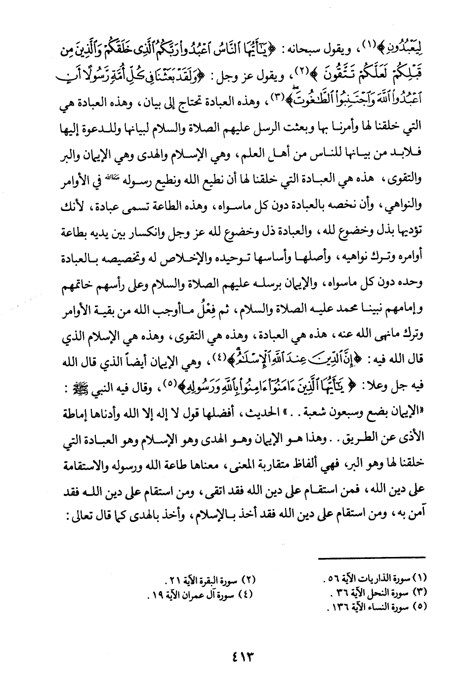 ويقول سبحانه: {يَا أَيُّهَا النَّاسُ اعْبُدُوا رَبَّكُمُ الَّذِي خَلَقَكُمْ وَالَّذِينَ مِنْ قَبْلِكُمْ لَعَلَّكُمْ تَتَّقُونَ} (¬1) ويقول عز وجل: {وَلَقَدْ بَعَثْنَا فِي كُلِّ أُمَّةٍ رَسُولًا أَنِ اُعْبُدُوا اللَّهَ وَاجْتَنِبُوا الطَّاغُوتَ} (¬2) وهذه العبادة تحتاج إلى بيان، وهذه العبادة هي التي خلقنا لها، وأمرنا بها، وبعثت الرسل عليهم الصلاة والسلام لبيانها وللدعوة إليها، فلا بد من بيانها للناس من أهل العلم، وهي الإسلام والهدى وهي الإيمان والبر والتقوى، هذه هي العبادة التي خلقنا لها أن نطيع الله ونطيع رسوله صلى الله عليه وسلم في الأوامر والنواهي، وأن نخصه بالعبادة دون كل ما سواه، وهذه الطاعة تسمى عبادة؛ لأنك تؤديها بذل وخضوع لله، والعبادة ذل وخضوع لله عز وجل وانكسار بين يديه بطاعة أوامره وترك نواهيه، وأصلها وأساسها توحيده، والإخلاص له، وتخصيصه بالعبادة وحده دون كل ما سواه، والإيمان برسله عليهم الصلاة والسلام وعلى رأسهم خاتمهم وإمامهم نبينا محمد عليه الصلاة والسلام، ثم فعل ما أوجب الله من بقية الأوامر وترك ما نهى الله عنه، هذه هي العبادة، وهذه هي التقوى، وهذه هي الإسلام الذي قال الله فيه: {إِنَّ الدِّينَ عِنْدَ اللَّهِ الْإِسْلَامُ} (¬3) وهي الإيمان أيضا الذي قال الله فيه جل وعلا: {يَا أَيُّهَا الَّذِينَ آمَنُوا آمِنُوا بِاللَّهِ وَرَسُولِهِ} (¬4) وقال فيه النبي صلى الله عليه وسلم: «الإيمان بضع وسبعون شعبة (¬5) » الحديث، «أفضلها قول لا إله إلا الله وأدناها إماطة الأذى عن الطريق (¬6) » .
