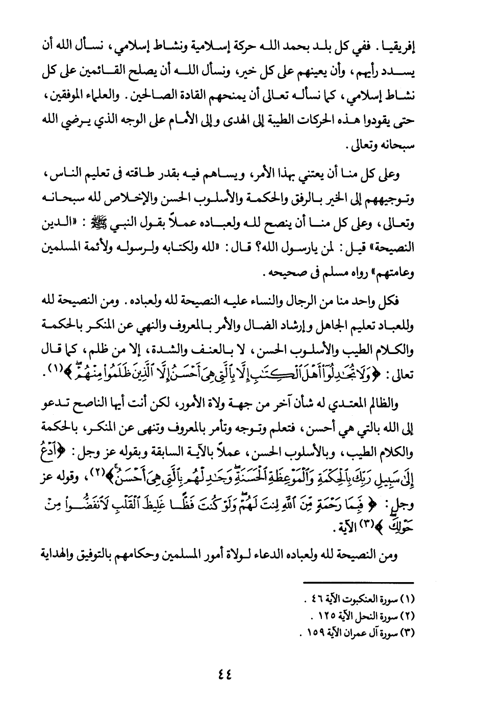 إفريقيا. ففي كل بلد بحمد الله حركة إسلامية ونشاط إسلامي، نسأل الله أن يسدد رأيهم، وأن يعينهم على كل خير، ونسأل الله أن يصلح القائمين على كل نشاط إسلامي، كما نسأله تعالى أن يمنحهم القادة الصالحين، والعلماء الموفقين؛ حتى يقودوا هذه الحركات الطيبة إلى الهدى وإلى الأمام، على الوجه الذي يرضي الله سبحانه وتعالى.