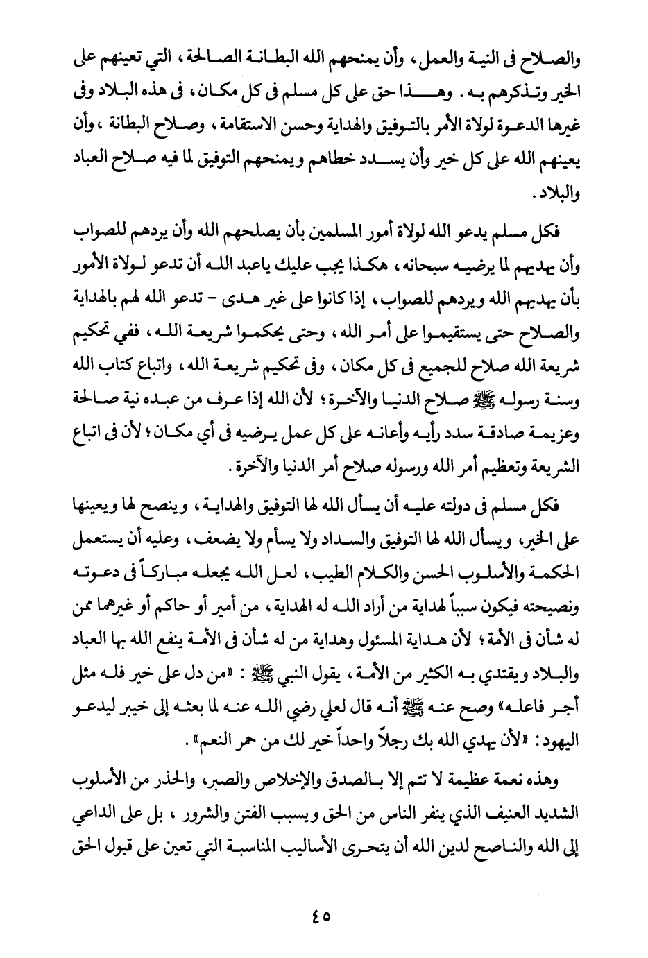 فكل مسلم في دولته عليه أن يسأل الله لها التوفيق والهداية، وينصح لها، ويعينها على الخير، ويسأل الله لها التوفيق والسداد، ولا يسأم ولا يضعف، وعليه أن يستعمل الحكمة والأسلوب الحسن والكلام الطيب، لعل الله يجعله مباركا في دعوته ونصيحته، فيكون سببا لهداية من أراد الله له الهداية من أمير أو حاكم أو غيرهما ممن له شأن في الأمة؛ لأن هداية المسئول وهداية من له شأن في الأمة ينفع الله بها العباد والبلاد، ويقتدي به الكثير من الأمة، يقول النبي صلى الله عليه وسلم: «من دل على خير فله مثل أجر فاعله (¬1) » وصح عنه صلى الله عليه وسلم أنه قال لعلي رضي الله عنه لما بعثه إلى خيبر ليدعو اليهود: «لأن يهدي الله بك رجلا واحدا خير لك من حمر النعم (¬2) » .