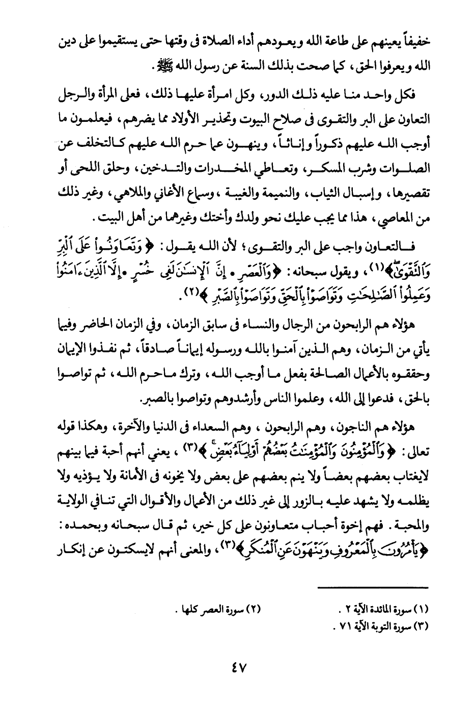 هؤلاء هم الناجون وهم الرابحون وهم السعداء في الدنيا والآخرة، وهكذا قوله تعالى: {وَالْمُؤْمِنُونَ وَالْمُؤْمِنَاتُ بَعْضُهُمْ أَوْلِيَاءُ بَعْضٍ} (¬5) يعني أنهم أحبة فيما بينهم لا يغتاب بعضهم بعضا ولا ينم بعضهم على بعض ولا يخونه في الأمانة ولا يؤذيه ولا يظلمه ولا يشهد عليه بالزور إلى غير ذلك من الأعمال والأقوال التي تنافي الولاية والمحبة. فهم إخوة أحباب متعاونون على كل خير، ثم قال سبحانه وبحمده: {يَأْمُرُونَ بِالْمَعْرُوفِ وَيَنْهَوْنَ عَنِ الْمُنْكَرِ} (¬6) والمعنى أنهم لا يسكتون عن إنكار