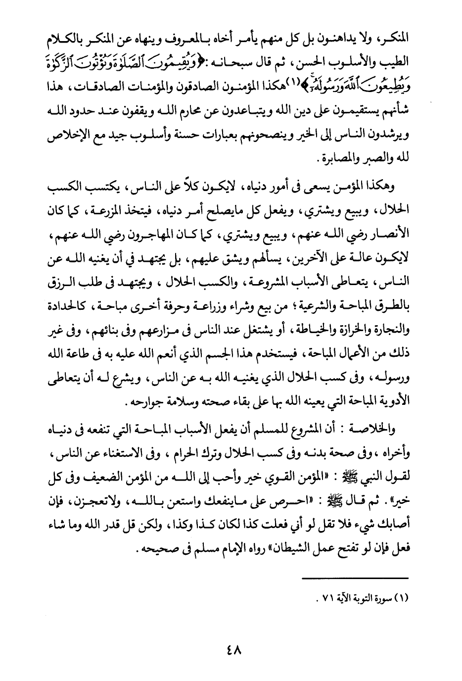 وهكذا المؤمن يسعى في أمور دنياه لا يكون كلا على الناس، يكتسب الكسب الحلال، ويبيع ويشتري، ويفعل كل ما يصلح أمر دنياه، فيتخذ المزرعة كما كان الأنصار رضي الله عنهم، ويبيع ويشتري، كما كان المهاجرون رضي الله عنهم، لا يكون عالة على الآخرين، يسألهم ويشق عليهم، بل يجتهد في أن يغنيه الله عن الناس، يتعاطى الأسباب المشروعة والكسب الحلال، ويجتهد في طلب الرزق بالطرق المباحة والشرعية. من بيع وشراء، وزراعة، وحرفة أخرى مباحة؛ كالحدادة والنجارة والخرازة والخياطة، أو يشتغل عند الناس في مزارعهم وفي بنائهم وفي غير ذلك من الأعمال المباحة، فيستخدم هذا الجسم الذي أنعم الله عليه به في طاعة الله ورسوله، وفي كسب الحلال الذي يغنيه الله به عن الناس، ويشرع له أن يتعاطى الأدوية المباحة التي يعينه الله بها على بقاء صحته وسلامة جوارحه.