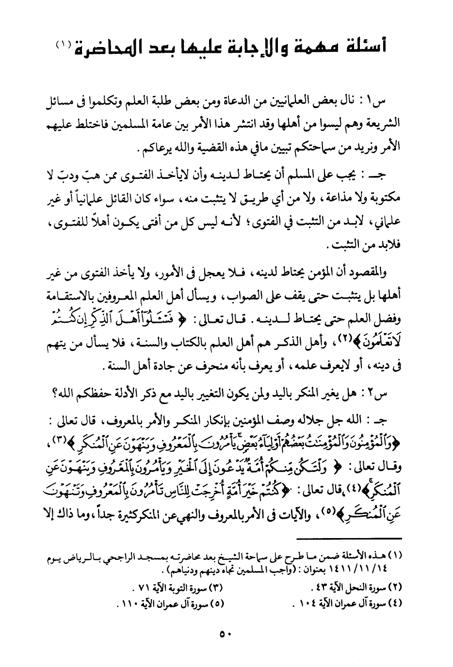 ج: الله جل جلاله وصف المؤمنين بإنكار المنكر والأمر بالمعروف قال تعالى: {وَالْمُؤْمِنُونَ وَالْمُؤْمِنَاتُ بَعْضُهُمْ أَوْلِيَاءُ بَعْضٍ يَأْمُرُونَ بِالْمَعْرُوفِ وَيَنْهَوْنَ عَنِ الْمُنْكَرِ} (¬1) وقال تعالى: {وَلْتَكُنْ مِنْكُمْ أُمَّةٌ يَدْعُونَ إِلَى الْخَيْرِ وَيَأْمُرُونَ بِالْمَعْرُوفِ وَيَنْهَوْنَ عَنِ الْمُنْكَرِ} (¬2) قال تعالى: {كُنْتُمْ خَيْرَ أُمَّةٍ أُخْرِجَتْ لِلنَّاسِ تَأْمُرُونَ بِالْمَعْرُوفِ وَتَنْهَوْنَ عَنِ الْمُنْكَرِ} (¬3) والآيات في الأمر بالمعروف والنهي عن المنكر كثيرة جدا، وما ذاك إلا