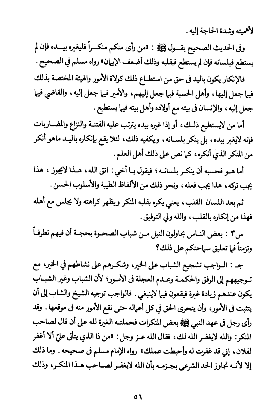 ج: الواجب تشجيع الشباب على الخير وشكرهم على نشاطهم في الخير مع توجيههم إلى الرفق والحكمة وعدم العجلة في الأمور؛ لأن الشباب وغير الشباب يكون عندهم زيادة غيرة فيقعون فيما لا ينبغي. فالواجب توجيه الشيخ والشاب إلى أن يتثبت في الأمور وأن يتحرى الحق في كل أعماله حتى تقع الأمور منه في موقعها. وقد رأى رجل في عهد النبي صلى الله عليه وسلم بعض المنكرات فحملته الغيرة لله على أن قال لصاحب المنكر: والله لا يغفر الله لك فقال الله عز وجل: «من ذا الذي يتألى علي ألا أغفر لفلان، إني قد غفرت له وأحبطت عملك (¬1) » رواه الإمام مسلم في صحيحه. وما ذلك إلا لأنه تجاوز الحد الشرعي بجزمه بأن الله لا يغفر لصاحب هذا المنكر وذلك