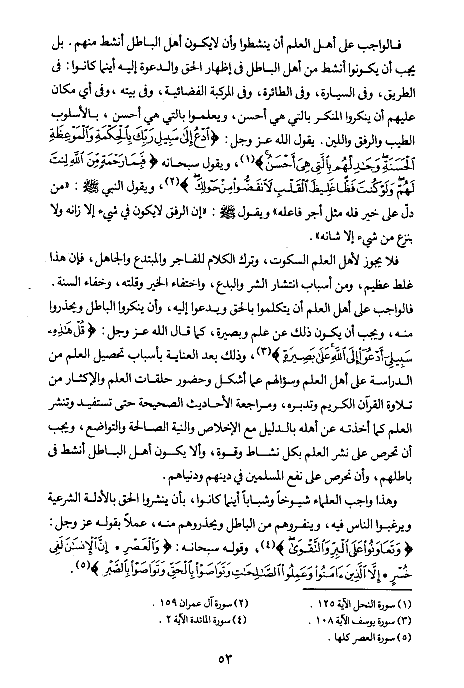 وهذا واجب العلماء شيوخا وشبابا أينما كانوا بأن ينشروا الحق بالأدلة الشرعية، ويرغبوا الناس فيه، وينفروهم من الباطل، ويحذروهم منه؛ عملا بقوله عز وجل: {وَتَعَاوَنُوا عَلَى الْبِرِّ وَالتَّقْوَى} (¬6) وقوله سبحانه: {وَالْعَصْرِ} (¬7) {إِنَّ الْإِنْسَانَ لَفِي خُسْرٍ} (¬8) {إِلَّا الَّذِينَ آمَنُوا وَعَمِلُوا الصَّالِحَاتِ وَتَوَاصَوْا بِالْحَقِّ وَتَوَاصَوْا بِالصَّبْرِ} (¬9)