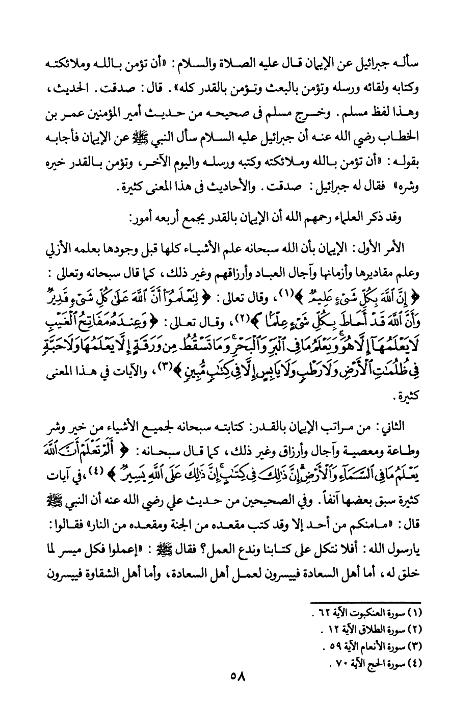سأله جبرائيل عن الإيمان قال عليه الصلاة والسلام: «أن تؤمن بالله وملائكته وكتابه ولقائه ورسله وتؤمن بالبعث وتؤمن بالقدر كله، قال: صدقت (¬1) » الحديث، وهذا لفظ مسلم. وخرج مسلم في صحيحه من حديث أمير المؤمنين عمر بن الخطاب رضي الله عنه أن جبرائيل عليه السلام سأل النبي صلى الله عليه وسلم عن الإيمان فأجابه بقوله: «أن تؤمن بالله وملائكته وكتبه ورسله واليوم الآخر وتؤمن بالقدر خيره وشره فقال له جبرائيل صدقت (¬2) » والأحاديث في هذا المعنى كثيرة.