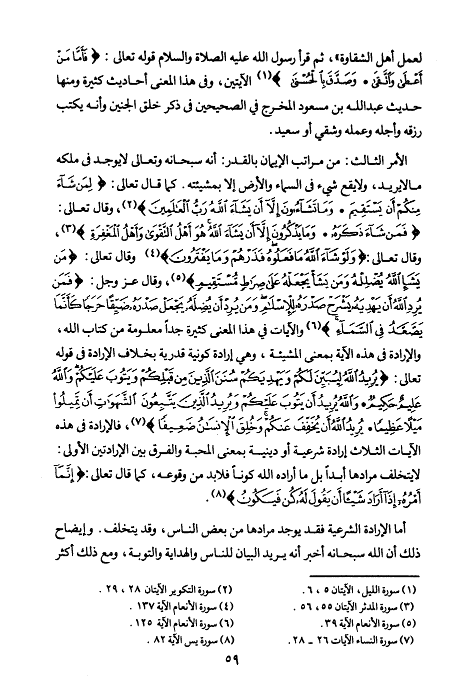 الأمر الثالث: من مراتب الإيمان بالقدر: أنه سبحانه وتعالى لا يوجد في ملكه ما لا يريد ولا يقع شيء في السماء والأرض إلا بمشيئته. كما قال تعالى: {لِمَنْ شَاءَ مِنْكُمْ أَنْ يَسْتَقِيمَ} (¬4) {وَمَا تَشَاءُونَ إِلَّا أَنْ يَشَاءَ اللَّهُ رَبُّ الْعَالَمِينَ} (¬5) وقال تعالى: {فَمَنْ شَاءَ ذَكَرَهُ} (¬6) {وَمَا يَذْكُرُونَ إِلَّا أَنْ يَشَاءَ اللَّهُ هُوَ أَهْلُ التَّقْوَى وَأَهْلُ الْمَغْفِرَةِ} (¬7) وقال تعالى: {وَلَوْ شَاءَ رَبُّكَ مَا فَعَلُوهُ فَذَرْهُمْ وَمَا يَفْتَرُونَ} (¬8) وقال تعالى: {مَنْ يَشَأِ اللَّهُ يُضْلِلْهُ وَمَنْ يَشَأْ يَجْعَلْهُ عَلَى صِرَاطٍ مُسْتَقِيمٍ} (¬9) وقال عز وجل: {فَمَنْ يُرِدِ اللَّهُ أَنْ يَهدِيَهُ يَشْرَحْ صَدْرَهُ لِلْإِسْلَامِ وَمَنْ يُرِدْ أَنْ يُضِلَّهُ يَجْعَلْ صَدْرَهُ ضَيِّقًا حَرَجًا كَأَنَّمَا يَصَّعَّدُ فِي السَّمَاءِ كَذَلِكَ يَجْعَلُ اللَّهُ الرِّجْسَ عَلَى الَّذِينَ لَا يُؤْمِنُونَ} (¬10) والآيات في هذا المعنى كثيرة جدا، معلومة من كتاب الله، والإرادة في هذه الآية بمعنى المشيئة، وهي إرادة كونية قدرية، بخلاف الإرادة في قوله تعالى: {يُرِيدُ اللَّهُ لِيُبَيِّنَ لَكُمْ وَيَهْدِيَكُمْ سُنَنَ الَّذِينَ مِنْ قَبْلِكُمْ وَيَتُوبَ عَلَيْكُمْ وَاللَّهُ عَلِيمٌ حَكِيمٌ} (¬11) {وَاللَّهُ يُرِيدُ أَنْ يَتُوبَ عَلَيْكُمْ وَيُرِيدُ الَّذِينَ يَتَّبِعُونَ الشَّهَوَاتِ أَنْ تَمِيلُوا مَيْلًا عَظِيمًا} (¬12) {يُرِيدُ اللَّهُ أَنْ يُخَفِّفَ عَنْكُمْ وَخُلِقَ الْإِنْسَانُ ضَعِيفًا} (¬13) فالإرادة في هذه الآيات الثلاث إرادة شرعية أو دينية، بمعنى المحبة، والفرق بين الإرادتين: الأولى: لا يتخلف مرادها أبدا بل ما أراده الله كونا فلا بد من وقوعه كما قال تعالى: {إِنَّمَا أَمْرُهُ إِذَا أَرَادَ شَيْئًا أَنْ يَقُولَ لَهُ كُنْ فَيَكُونُ} (¬14)