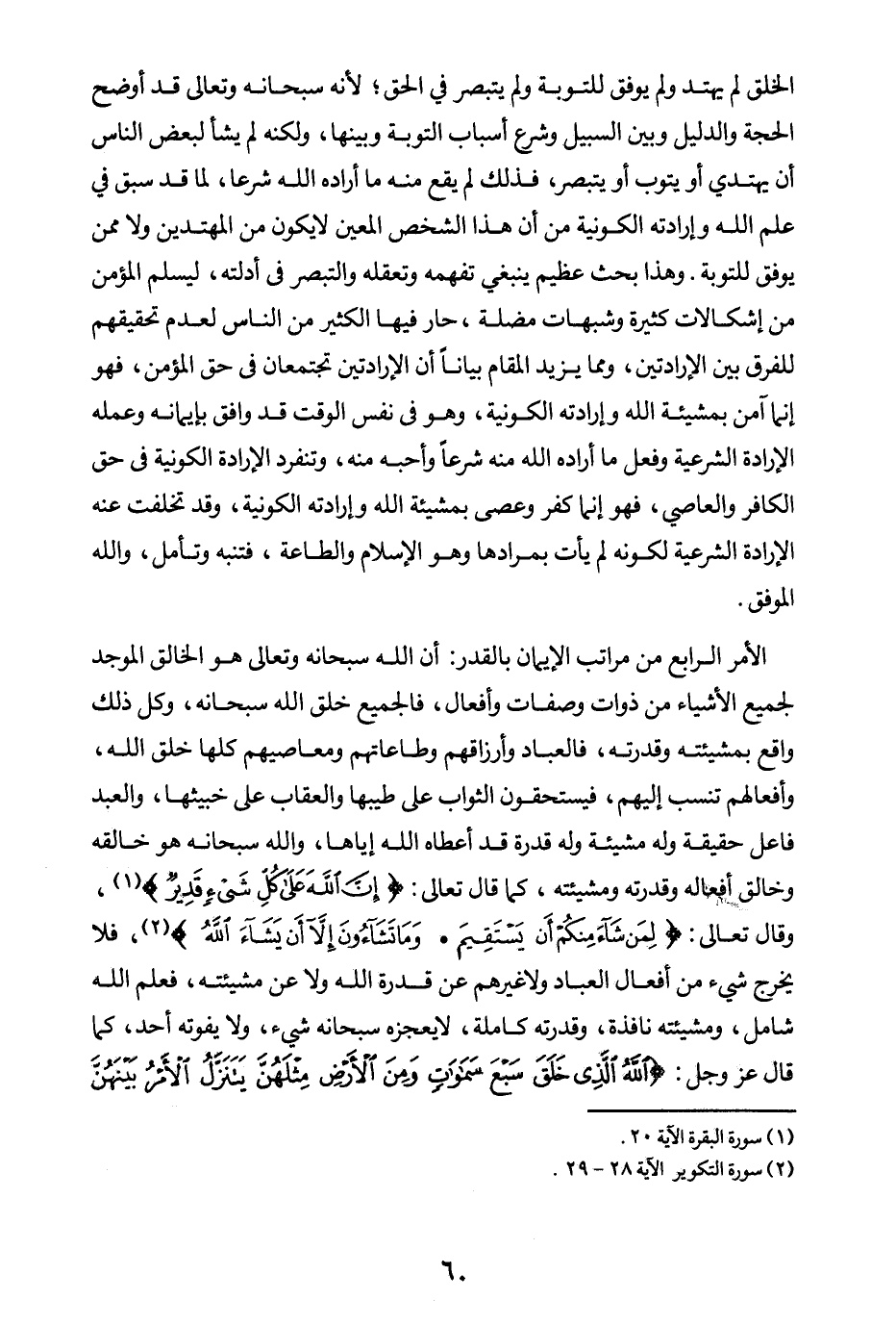 الأمر الرابع من مراتب الإيمان بالقدر: أن الله سبحانه وتعالى هو الخالق الموجد لجميع الأشياء من ذوات وصفات وأفعال، فالجميع خلق الله سبحانه، وكل ذلك واقع بمشيئته وقدرته، فالعباد وأرزاقهم وطاعاتهم ومعاصيهم كلها خلق الله وأفعالهم، تنسب إليهم فيستحقون الثواب على طيبها والعقاب على خبيثها، والعبد فاعل حقيقة، وله مشيئة، وله قدرة قد أعطاه الله إياها، والله سبحانه هو خالقه وخالق أفعاله وقدرته ومشيئته، كما قال تعالى: {إِنَّ اللَّهَ عَلَى كُلِّ شَيْءٍ قَدِيرٌ} (¬1) وقال تعالى: {لِمَنْ شَاءَ مِنْكُمْ أَنْ يَسْتَقِيمَ} (¬2) {وَمَا تَشَاءُونَ إِلَّا أَنْ يَشَاءَ اللَّهُ} (¬3) فلا يخرج شيء من أفعال العباد ولا غيرهم عن قدرة الله ولا عن مشيئته، فعلم الله شامل، ومشيئته نافذة، وقدرته كاملة، لا يعجزه سبحانه شيء، ولا يفوته أحد كما قال عز وجل: {اللَّهُ الَّذِي خَلَقَ سَبْعَ سَمَاوَاتٍ وَمِنَ الْأَرْضِ مِثْلَهُنَّ يَتَنَزَّلُ الْأَمْرُ بَيْنَهُنَّ لِتَعْلَمُوا أَنَّ اللَّهَ عَلَى كُلِّ شَيْءٍ قَدِيرٌ وَأَنَّ اللَّهَ قَدْ أَحَاطَ بِكُلِّ شَيْءٍ عِلْمًا} (¬4)
