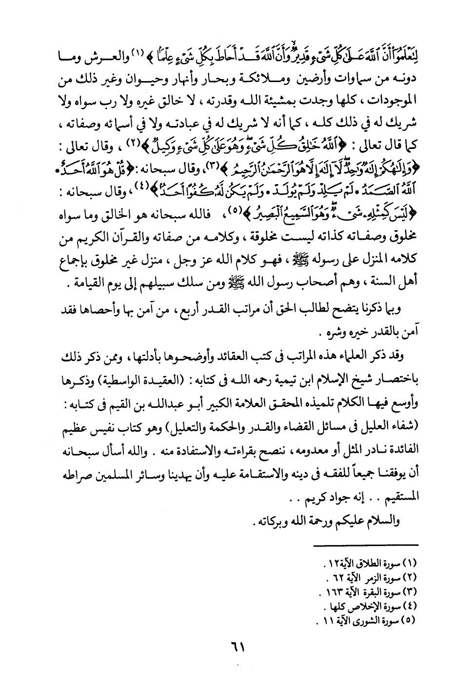 والعرش وما دونه من سماوات وأرضين وملائكة وبحار وأنهار وحيوان، وغير ذلك من الموجودات كلها وجدت بمشيئة الله وقدرته، لا خالق غيره، ولا رب سواه، ولا شريك له في ذلك كله، كما أنه لا شريك له في عبادته ولا في أسمائه وصفاته، كما قال تعالى: {اللَّهُ خَالِقُ كُلِّ شَيْءٍ وَهُوَ عَلَى كُلِّ شَيْءٍ وَكِيلٌ} (¬1) وقال تعالى: {وَإِلَهُكُمْ إِلَهٌ وَاحِدٌ لَا إِلَهَ إِلَّا هُوَ الرَّحْمَنُ الرَّحِيمُ} (¬2) وقال سبحانه: {قُلْ هُوَ اللَّهُ أَحَدٌ} (¬3) {اللَّهُ الصَّمَدُ} (¬4) {لَمْ يَلِدْ وَلَمْ يُولَدْ} (¬5) {وَلَمْ يَكُنْ لَهُ كُفُوًا أَحَدٌ} (¬6) وقال سبحانه: {لَيْسَ كَمِثْلِهِ شَيْءٌ وَهُوَ السَّمِيعُ الْبَصِيرُ} (¬7) فالله سبحانه هو الخالق وما سواه مخلوق، وصفاته كذاته ليست مخلوقة، وكلامه من صفاته والقرآن الكريم من كلامه المنزل على رسوله صلى الله عليه وسلم، فهو كلام الله عز وجل منزل غير مخلوق بإجماع أهل السنة، وهم أصحاب رسول الله صلى الله عليه وسلم ومن سلك سبيلهم إلى يوم القيامة.
