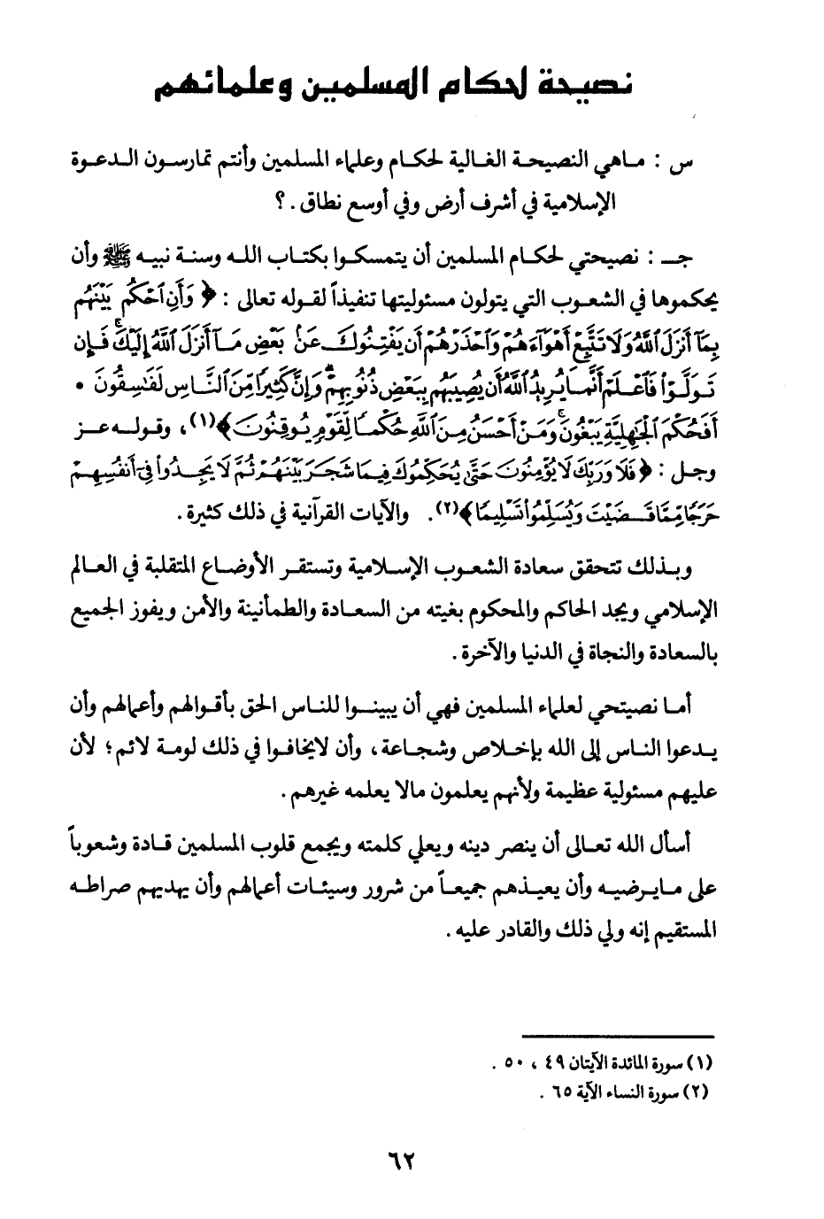 ج: نصيحتي لحكام المسلمين أن يتمسكوا بكتاب الله وسنة نبيه صلى الله عليه وسلم وأن يحكموها في الشعوب التي يتولون مسئوليتها تنفيذا لقوله تعالى: {وَأَنِ احْكُمْ بَيْنَهُمْ بِمَا أَنْزَلَ اللَّهُ وَلَا تَتَّبِعْ أَهْوَاءَهُمْ وَاحْذَرْهُمْ أَنْ يَفْتِنُوكَ عَنْ بَعْضِ مَا أَنْزَلَ اللَّهُ إِلَيْكَ فَإِنْ تَوَلَّوْا فَاعْلَمْ أَنَّمَا يُرِيدُ اللَّهُ أَنْ يُصِيبَهُمْ بِبَعْضِ ذُنُوبِهِمْ وَإِنَّ كَثِيرًا مِنَ النَّاسِ لَفَاسِقُونَ} (¬1) {أَفَحُكْمَ الْجَاهِلِيَّةِ يَبْغُونَ وَمَنْ أَحْسَنُ مِنَ اللَّهِ حُكْمًا لِقَوْمٍ يُوقِنُونَ} (¬2) وقوله عز وجل: {فَلَا وَرَبِّكَ لَا يُؤْمِنُونَ حَتَّى يُحَكِّمُوكَ فِيمَا شَجَرَ بَيْنَهُمْ ثُمَّ لَا يَجِدُوا فِي أَنْفُسِهِمْ حَرَجًا مِمَّا قَضَيْتَ وَيُسَلِّمُوا تَسْلِيمًا} (¬3) والآيات القرآنية في ذلك كثيرة.