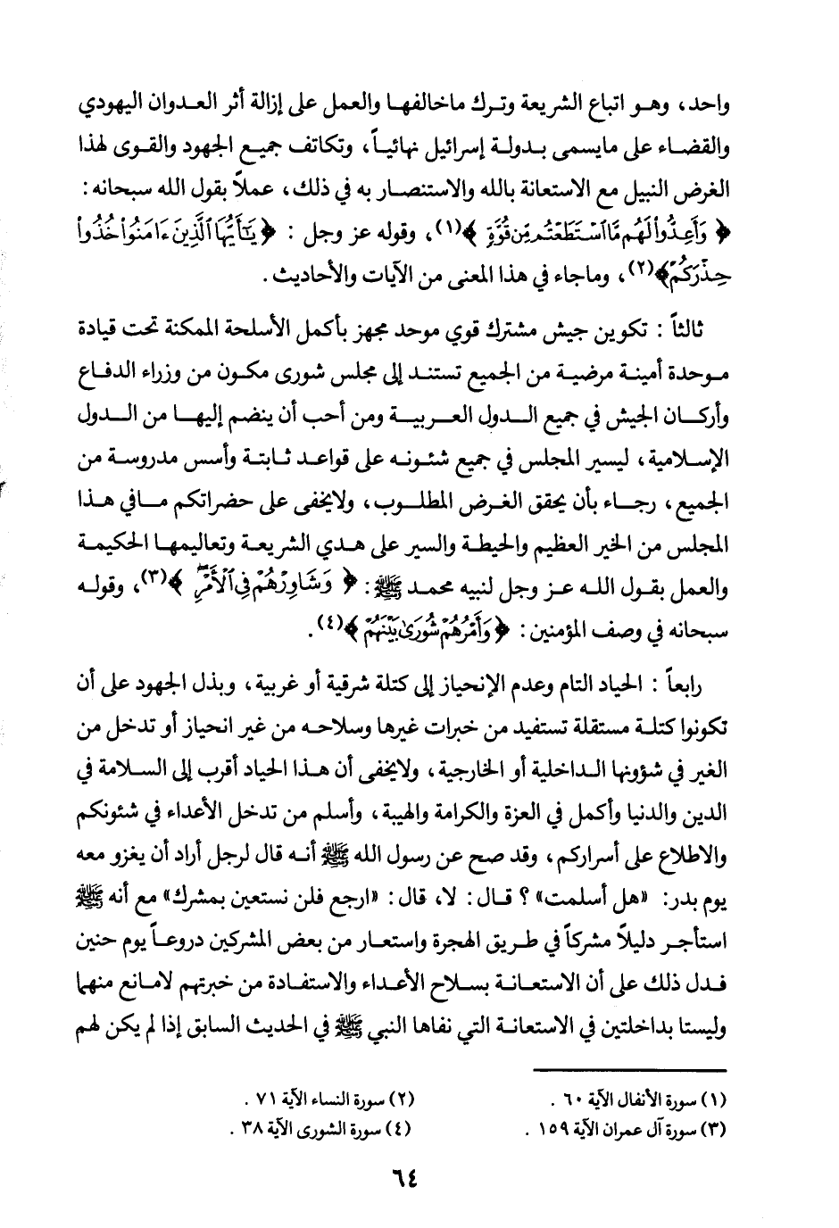 ثالثا: تكوين جيش مشترك قوي موحد مجهز بأكمل الأسلحة الممكنة تحت قيادة موحدة أمينة مرضية من الجميع، تستند إلى مجلس شورى مكون من وزراء الدفاع وأركان الجيش في جميع الدول العربية، ومن أحب أن ينضم إليها من الدول الإسلامية ليسير المجلس في جميع شئونه على قواعد ثابتة وأسس مدروسة من الجميع؛ رجاء بأن يحقق الغرض المطلوب، ولا يخفي على حضراتكم ما في هذا المجلس من الخير العظيم والحيطة والسير على هدي الشريعة وتعاليمها الحكيمة، والعمل بقول الله عز وجل لنبيه صلى الله عليه وسلم: {وَشَاوِرْهُمْ فِي الْأَمْرِ} (¬3) وقوله سبحانه في وصف المؤمنين: {وَأَمْرُهُمْ شُورَى بَيْنَهُمْ} (¬4)
