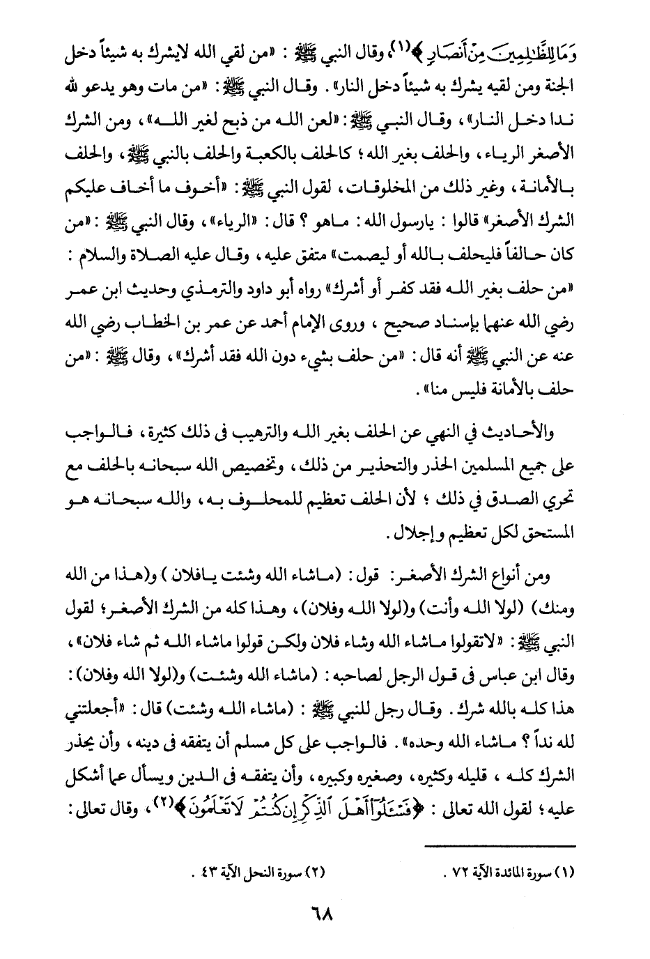 وقال النبي صلى الله عليه وسلم: «من لقي الله لا يشرك به شيئا دخل الجنة، ومن لقيه يشرك به شيئا دخل النار (¬1) » وقال النبي صلى الله عليه وسلم «من مات وهو يدعو لله ندا دخل النار (¬2) » وقال النبي صلى الله عليه وسلم «لعن الله من ذبح لغير الله (¬3) » ومن الشرك الأصغر الرياء والحلف بغير الله كالحلف بالكعبة، والحلف بالنبي صلى الله عليه وسلم، والحلف بالأمانة وغير ذلك من المخلوقات؛ لقول النبي صلى الله عليه وسلم: «أخوف ما أخاف عليكم الشرك الأصغر قالوا يا رسول الله ما هو؟ قال: الرياء (¬4) » وقال النبي صلى الله عليه وسلم «من كان حالفا فليحلف بالله أو ليصمت (¬5) » متفق عليه وقال عليه الصلاة والسلام «من حلف بغير الله فقد كفر أو أشرك (¬6) » رواه أبو داود والترمذي، وحديث ابن عمر رضي الله عنهما بإسناد صحيح، وروى الإمام أحمد عن عمر بن الخطاب رضي الله عنه عن النبي صلى الله عليه وسلم أنه قال: «من حلف بشيء دون الله فقد أشرك (¬7) » وقال صلى الله عليه وسلم: «من حلف بالأمانة فليس منا (¬8) » . والأحاديث في النهي عن الحلف بغير الله والترهيب في ذلك كثيرة فالواجب على جميع المسلمين الحذر والتحذير من ذلك وتخصيص الله سبحانه بالحلف مع تحري الصدق في ذلك؛ لأن الحلف تعظيم للمحلوف به، والله سبحانه هو المستحق لكل تعظيم وإجلال. ومن أنواع الشرك الأصغر: قول: (ما شاء الله وشئت يا فلان) ، (وهذا من الله ومنك) ، (لولا الله وأنت) ، (ولولا الله وفلان) ، وهذا كله من الشرك الأصغر؛ لقول النبي صلى الله عليه وسلم: «لا تقولوا ما شاء الله وشاء فلان ولكن قولوا ما شاء الله ثم شاء فلان (¬9) » وقال ابن عباس في قول الرجل لصاحبه: (ما شاء الله وشئت) ، (ولولا الله وفلان) : هذا كله بالله شرك «وقال رجل للنبي صلى الله عليه وسلم: ما شاء الله وشئت، قال: أجعلتني لله ندا؟ ما شاء الله وحده (¬10) » فالواجب على كل مسلم أن يتفقه في دينه، وأن يحذر الشرك كله قليله وكثيره وصغيره وكبيره، وأن يتفقه في الدين، ويسأل عما أشكل عليه؛ لقول الله تعالى: {فَاسْأَلُوا أَهْلَ الذِّكْرِ إِنْ كُنْتُمْ لَا تَعْلَمُونَ} (¬11)