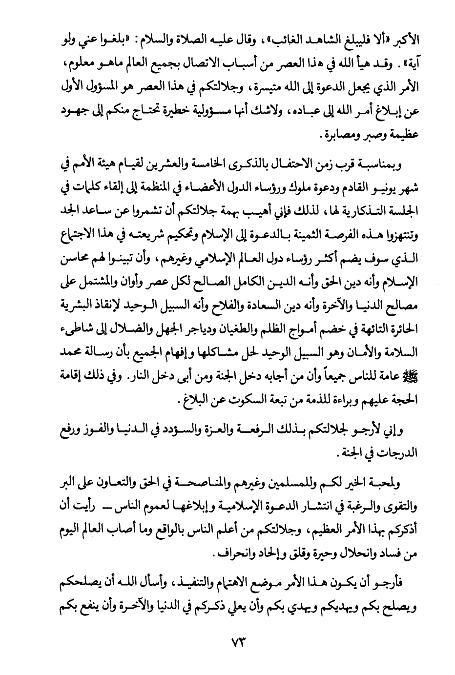 وبمناسبة قرب زمن الاحتفال بالذكرى الخامسة والعشرين لقيام هيئة الأمم في شهر يونيو القادم، ودعوة ملوك ورؤساء الدول الأعضاء في المنظمة إلى إلقاء كلمات في الجلسة التذكارية لها، لذلك فإني أهيب بهمة جلالتكم أن تشمروا عن ساعد الجد، وتنتهزوا هذه الفرصة الثمينة بالدعوة إلى الإسلام، وتحكيم شريعته في هذا الاجتماع الذي سوف يضم أكثر رؤساء دول العالم الإسلامي وغيرهم، وأن تبينوا لهم محاسن الإسلام، وأنه دين الحق، وأنه الدين الكامل الصالح لكل عصر وأوان، والمشتمل على مصالح الدنيا والآخرة، وأنه دين السعادة والفلاح، وأنه السبيل الوحيد لإنقاذ البشرية الحائرة التائهة في خضم أمواج الظلم والطغيان ودياجر الجهل والضلال إلى شاطئ السلامة والأمان، وهو السبيل الوحيد لحل مشاكلها وإفهام الجميع بأن رسالة محمد صلى الله عليه وسلم عامة للناس جميعا، وأن من أجابه دخل الجنة ومن أبى دخل النار. وفي ذلك إقامة الحجة عليهم وبراءة للذمة من تبعة السكوت عن البلاغ.
