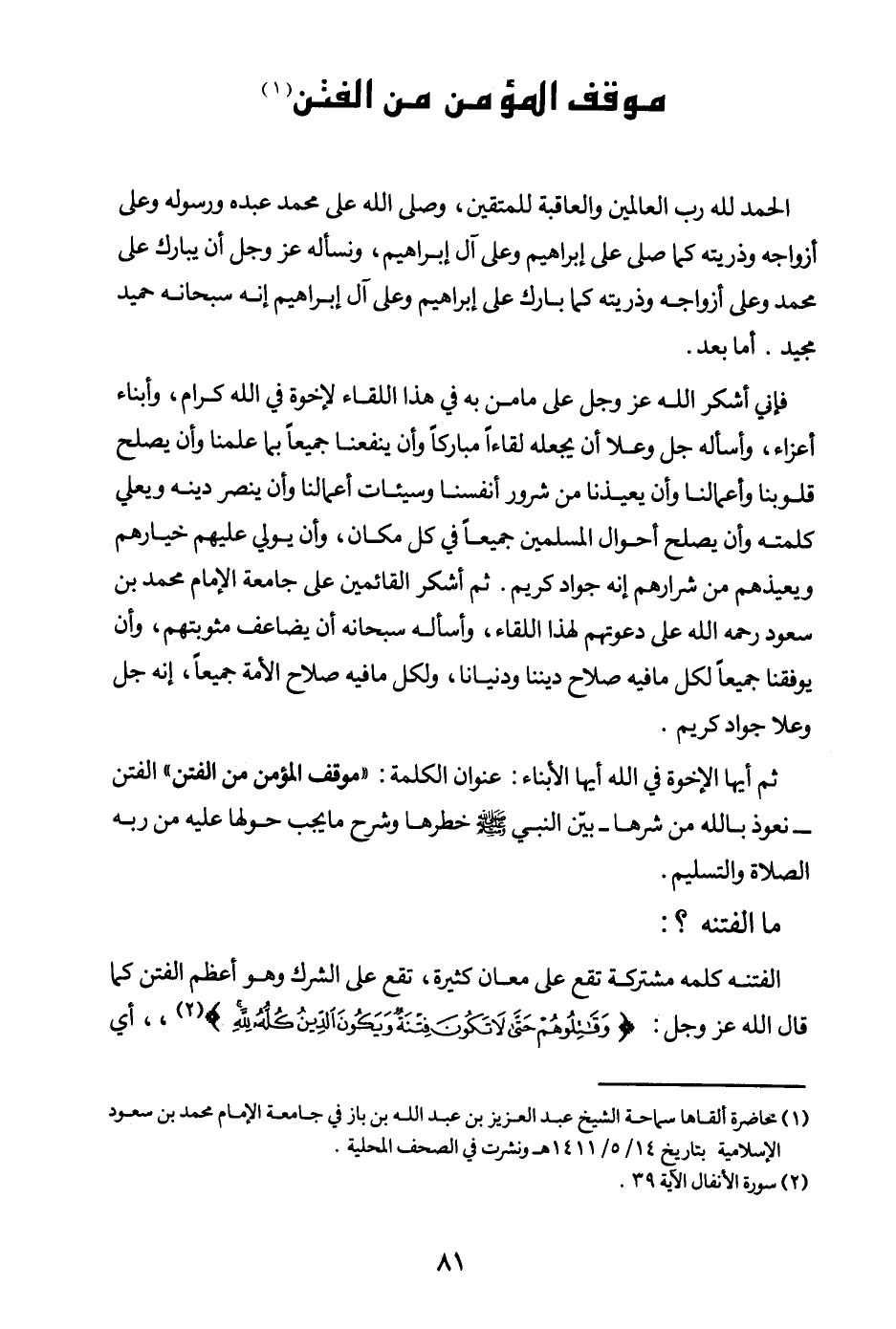 ثم أيها الإخوة في الله أيها الأبناء: عنوان الكلمة: (موقف المؤمن من الفتن) الفتن - نعوذ بالله من شرها - بين النبي صلى الله عليه وسلم خطرها وشرح ما يجب حولها عليه من ربه الصلاة والتسليم.