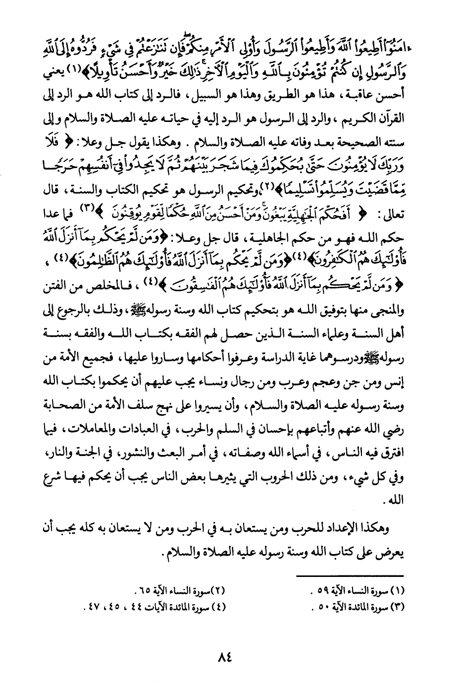 وهكذا يقول جل وعلا: {فَلَا وَرَبِّكَ لَا يُؤْمِنُونَ حَتَّى يُحَكِّمُوكَ فِيمَا شَجَرَ بَيْنَهُمْ ثُمَّ لَا يَجِدُوا فِي أَنْفُسِهِمْ حَرَجًا مِمَّا قَضَيْتَ وَيُسَلِّمُوا تَسْلِيمًا} (¬1) وتحكيم الرسول هو تحكيم الكتاب والسنة قال تعالى: {أَفَحُكْمَ الْجَاهِلِيَّةِ يَبْغُونَ وَمَنْ أَحْسَنُ مِنَ اللَّهِ حُكْمًا لِقَوْمٍ يُوقِنُونَ} (¬2) فما عدا حكم الله فهو من حكم الجاهلية قال جل وعلا: {وَمَنْ لَمْ يَحْكُمْ بِمَا أَنْزَلَ اللَّهُ فَأُولَئِكَ هُمُ الْكَافِرُونَ} (¬3) {وَمَنْ لَمْ يَحْكُمْ بِمَا أَنْزَلَ اللَّهُ فَأُولَئِكَ هُمُ الظَّالِمُونَ} (¬4) {وَمَنْ لَمْ يَحْكُمْ بِمَا أَنْزَلَ اللَّهُ فَأُولَئِكَ هُمُ الْفَاسِقُونَ} (¬5)